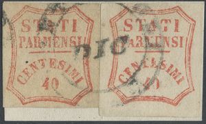 1859 - 40 cent. Vermiglio n.17 usati ed accostati come vennero usati in origine. Il valore di destra presenta [..]