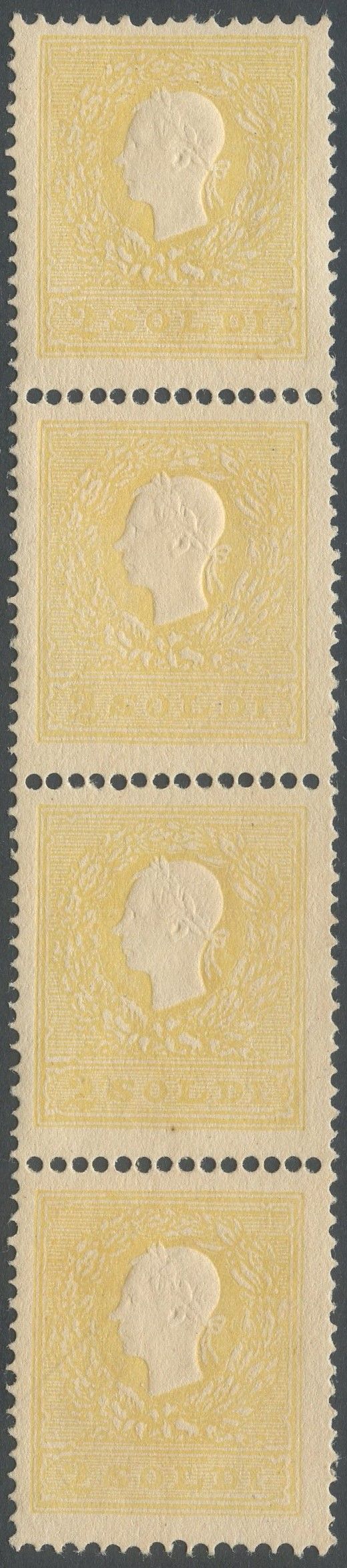 1859 - 2s. giallo n.28 in striscia verticale di 4 con gomma parziale e valutato come senza gomma. (A+) (Cert. Enzo Diena)