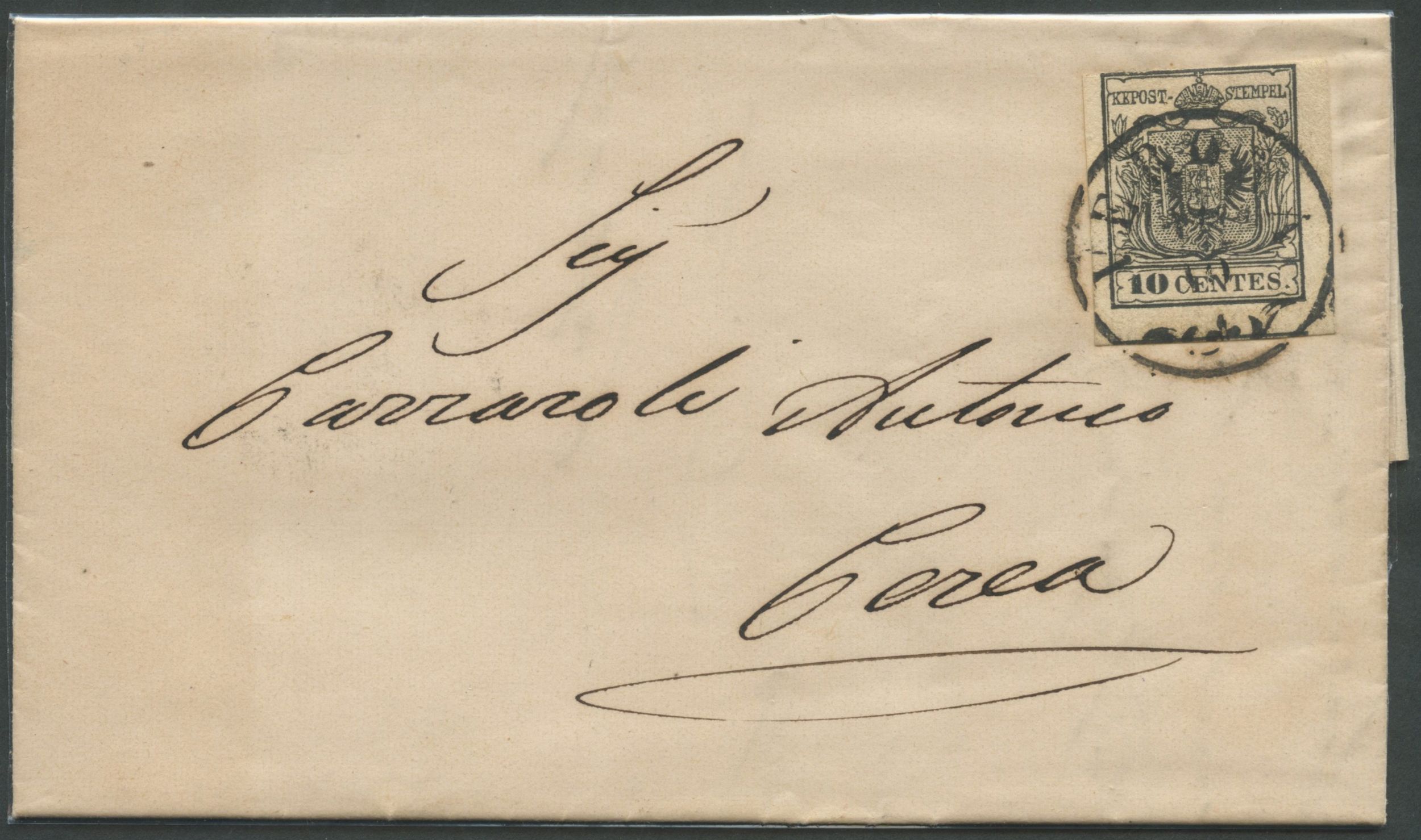 1858 - Lettera da Verona per Cerea affrancata tramite un 10c. Nero N.19 carta a macchina, tre grandi margini e sfiorato in alto. Non comune l'uso del N.19 per distretto postale. (A-)