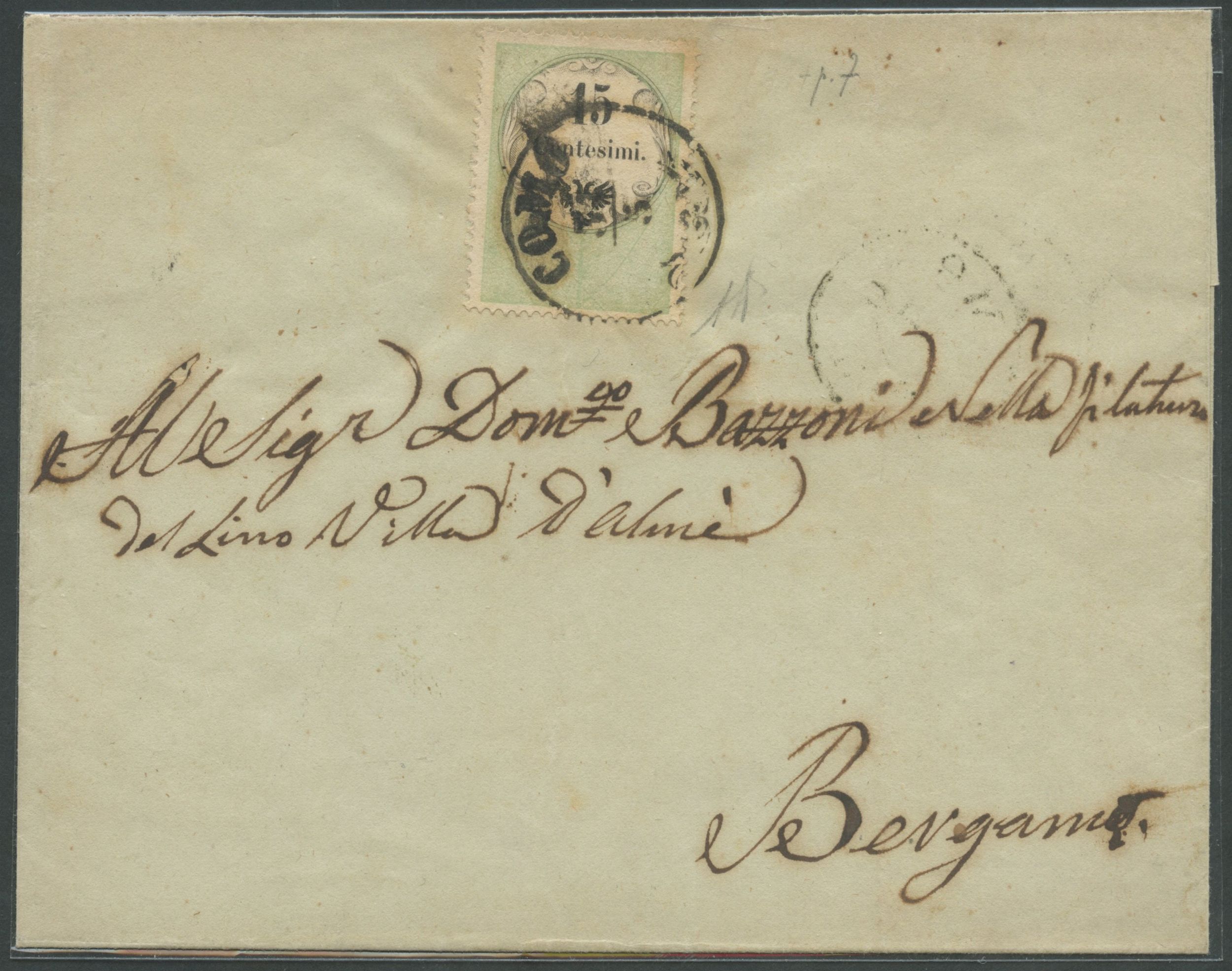 Lettera da Como per Bergamo affrancata con una Marca da Bollo da 15c. N.3 (Caratteri Tipografici) con annullo CO di COMO (7pt.). (A)