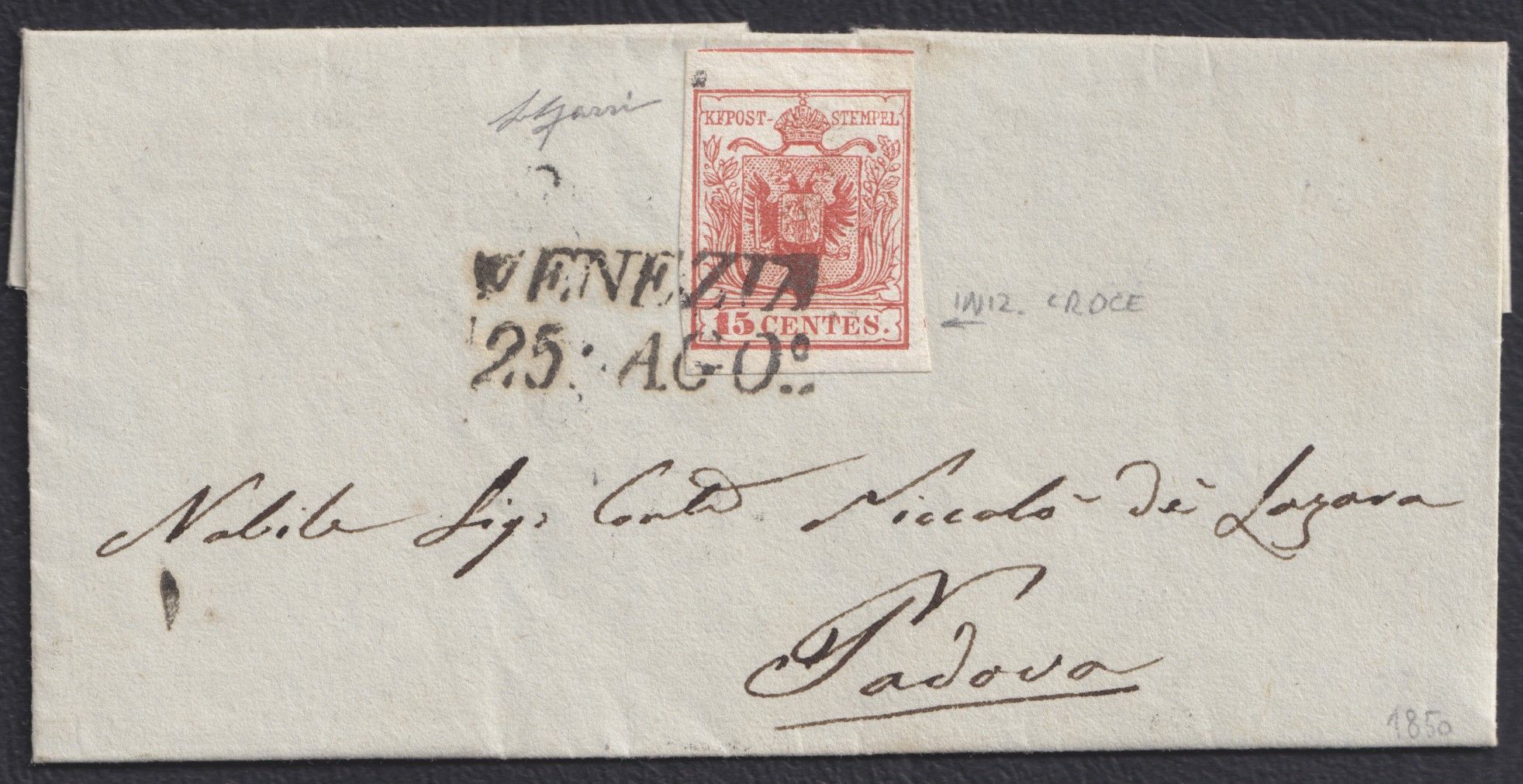 1850 - Lettera da Venezia per Padova affrancata tramite un 15 cent. rosso carminio I tiratura n.3b. Nel margine destro è visibile un principio di croce. (A+) (Gazzi)