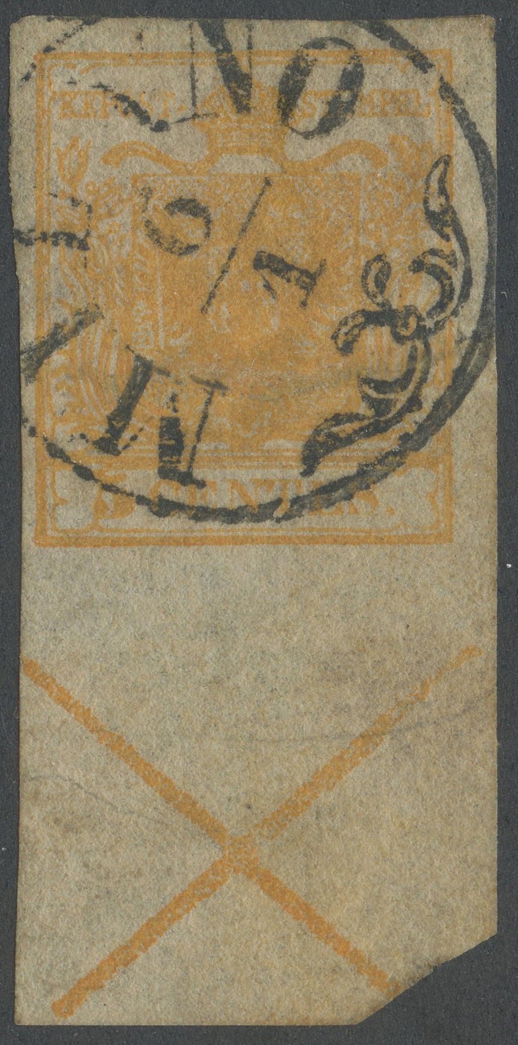 1850 - 5 cent. arancio n.1h con bordo di foglio inferiore e croce di S.Andrea. Quinto esemplare noto, inedito. (A-)