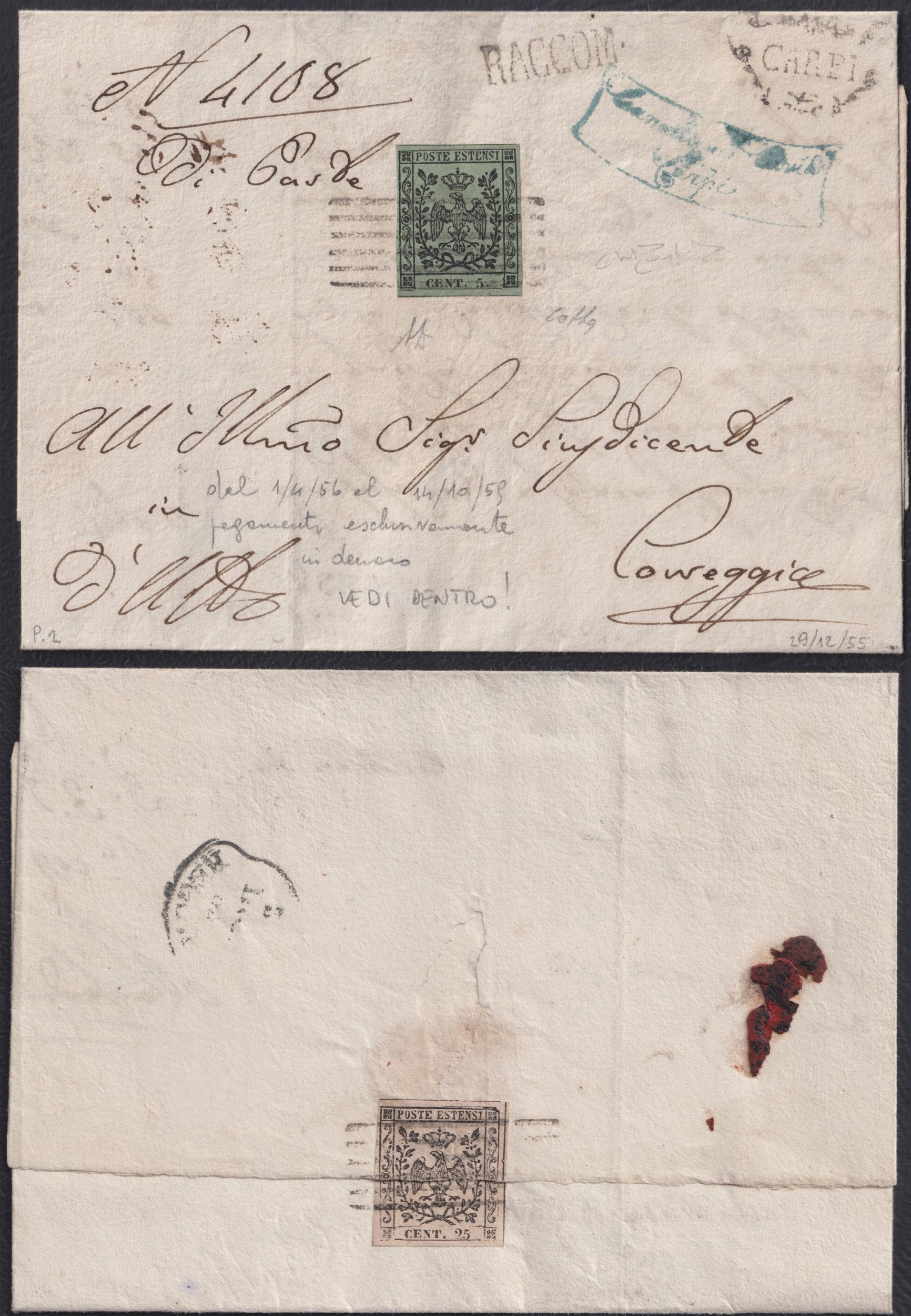 1858 - Lettera raccomandata da Carpi per Correggio affrancata tramite un 5 cent. verde oliva n.8 ed un 25 cent. camoscio chiaro n.4 al retro utilizzato come chiudilettera. (A-) (Alberto Diena, Raybaudi, Colla)