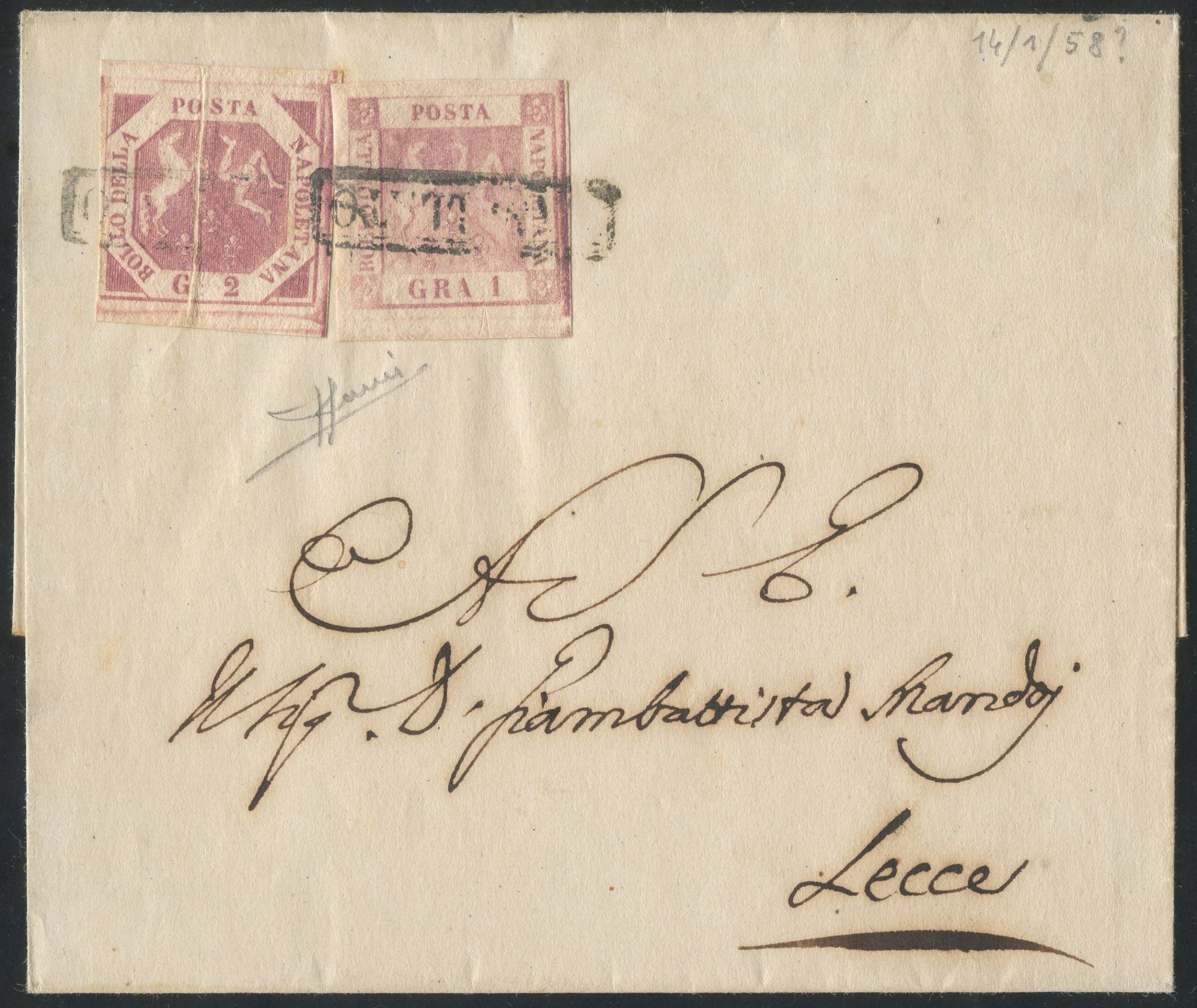 14.01.1858 - Busta da Napoli per Lecce affrancata per 3 grana tramite un 1 gr. rosa lillaceo n.3a + 2gr. rosa lillaceo n.5a con vistoso Pli D'accordeon. (A+) (Sorani)