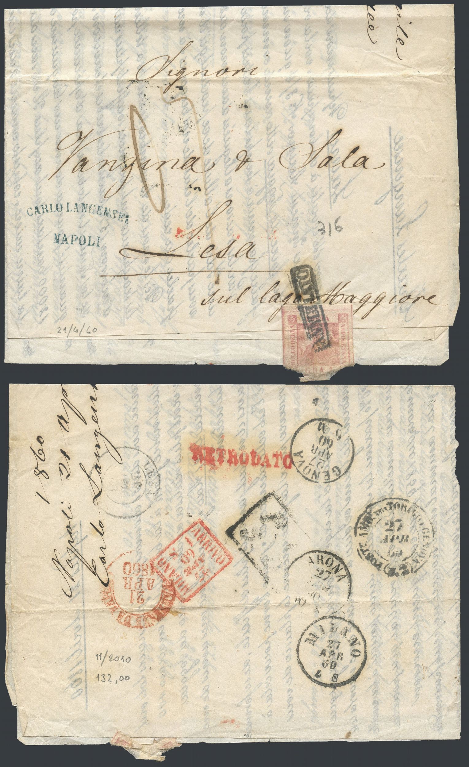 21.04.1860 - Lettera da Napoli per Lesa affrancata tramite un 1gr. rosa chiaro n.3 utilizzato come chiudilettera. Interessante oggetto postale.