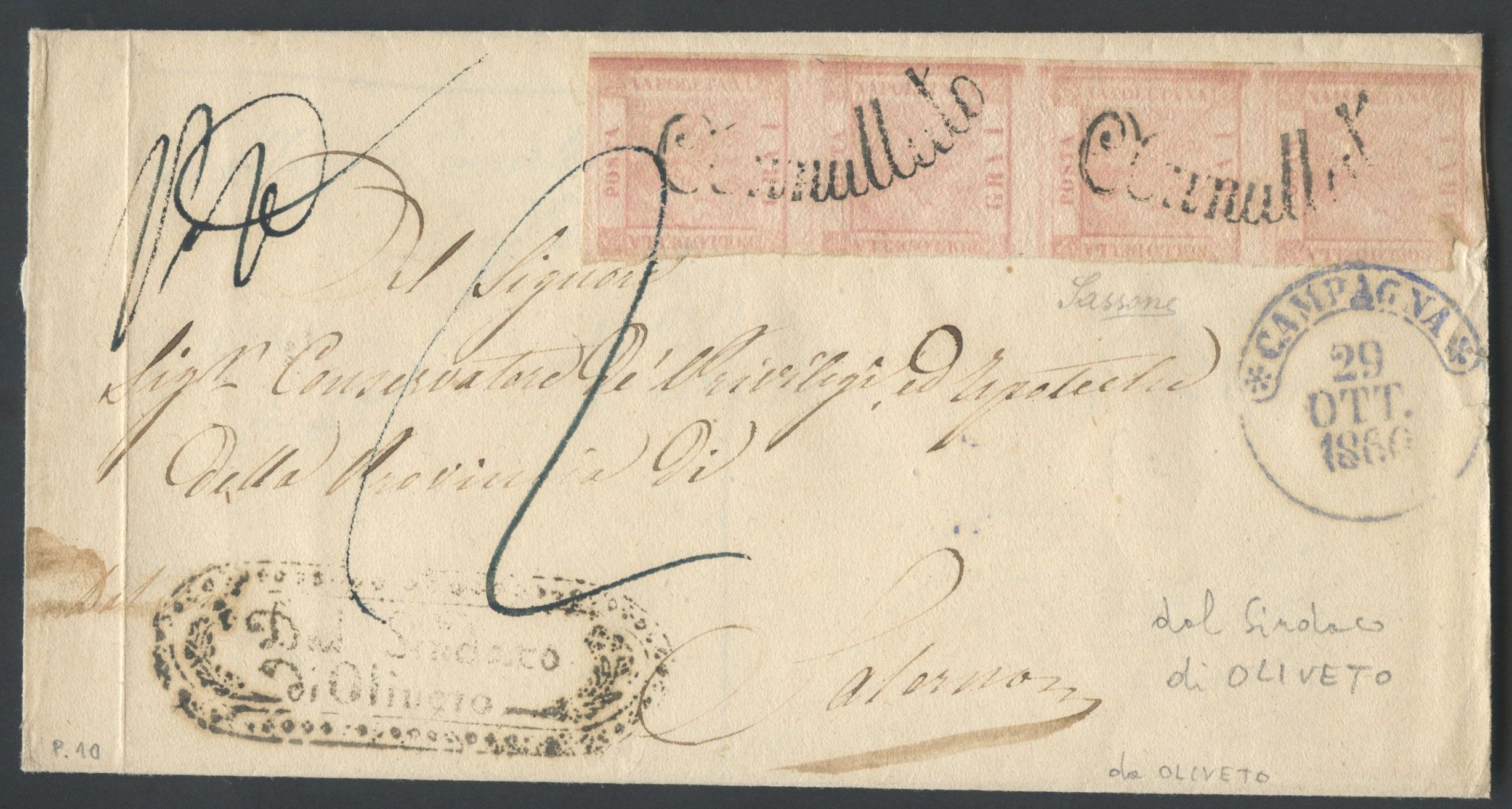 29.10.1860 - Lettera da Campagna per Palermo affrancata per 4 grana tramite una striscia di quattro del 1gr. rosa chiaro n.4. Sull'affrancatura lo svolazzo tipo 14 (10pt.) (B) (Sassone)