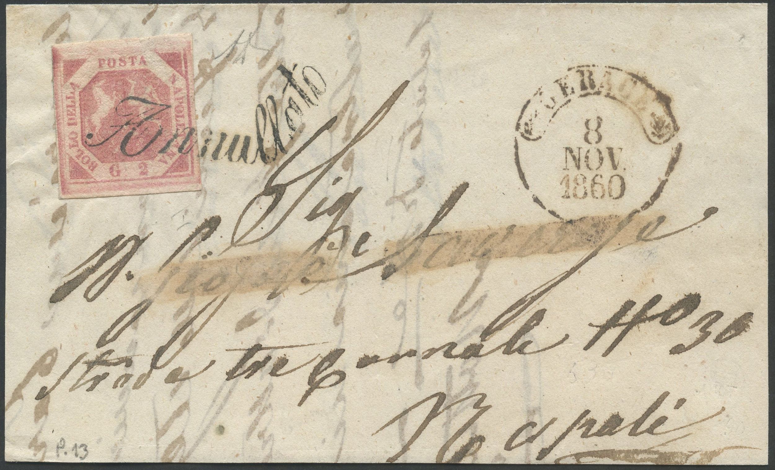 08.11.1860 - Lettera da Gerace per Napoli affrancata tramite un 2gr rosa chiaro n.5. Sull'affrancatura lo svolazzo tipo 22 di GERACE (13pt.). La lettera è leggermente rifilata in basso, la lettera è completa di tutti gli annulli di partenza e arrivo) (A) (Alberto Diena)