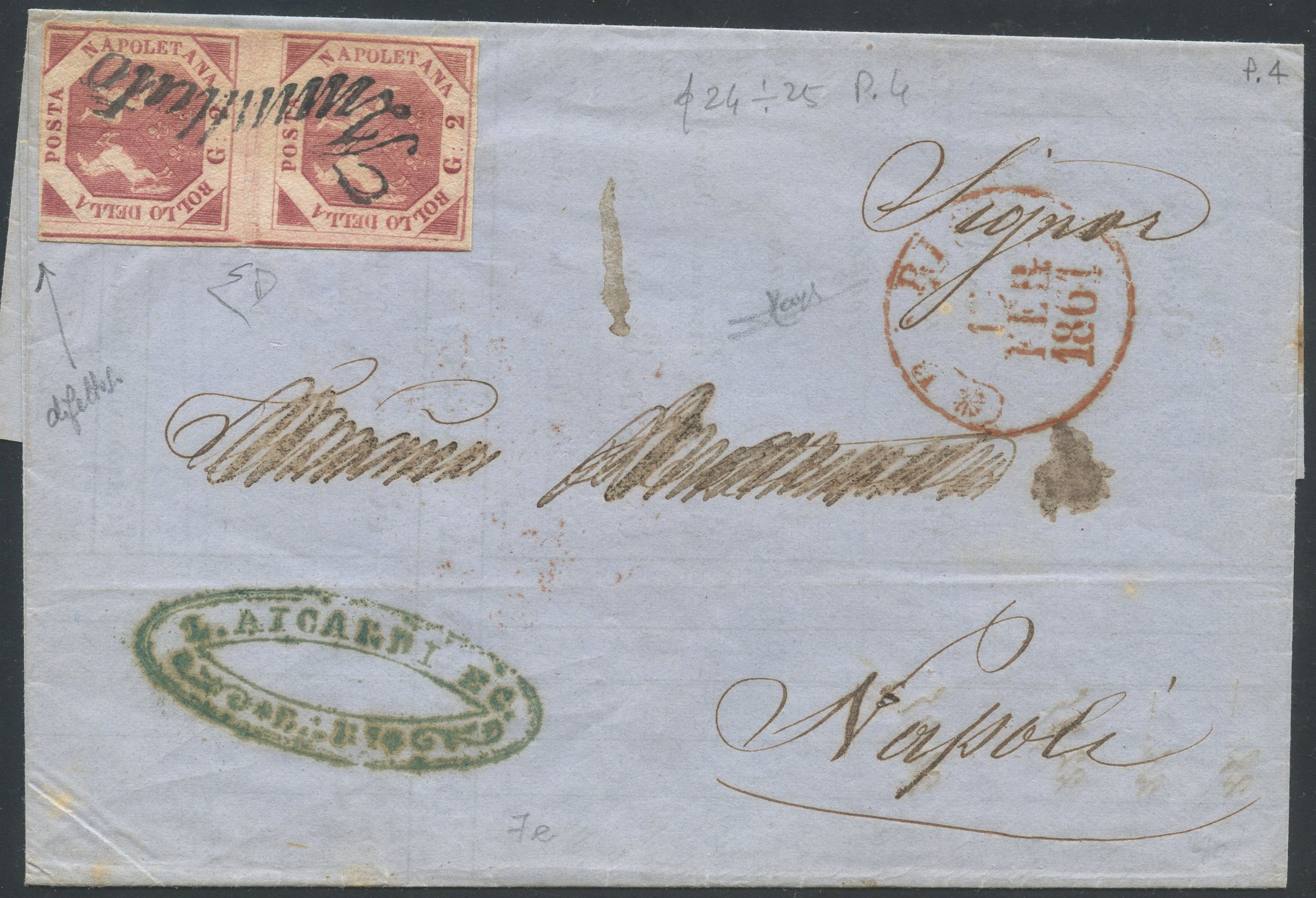 13.02.1861 - Lettera da Bari per Napoli affrancata tramite una coppia del 2gr. carminio vivo n.7e. Sull'affrancatura lo svolazzo del tipo 36 di Bari. (A-) (Enzo Diena, Raybaudi)