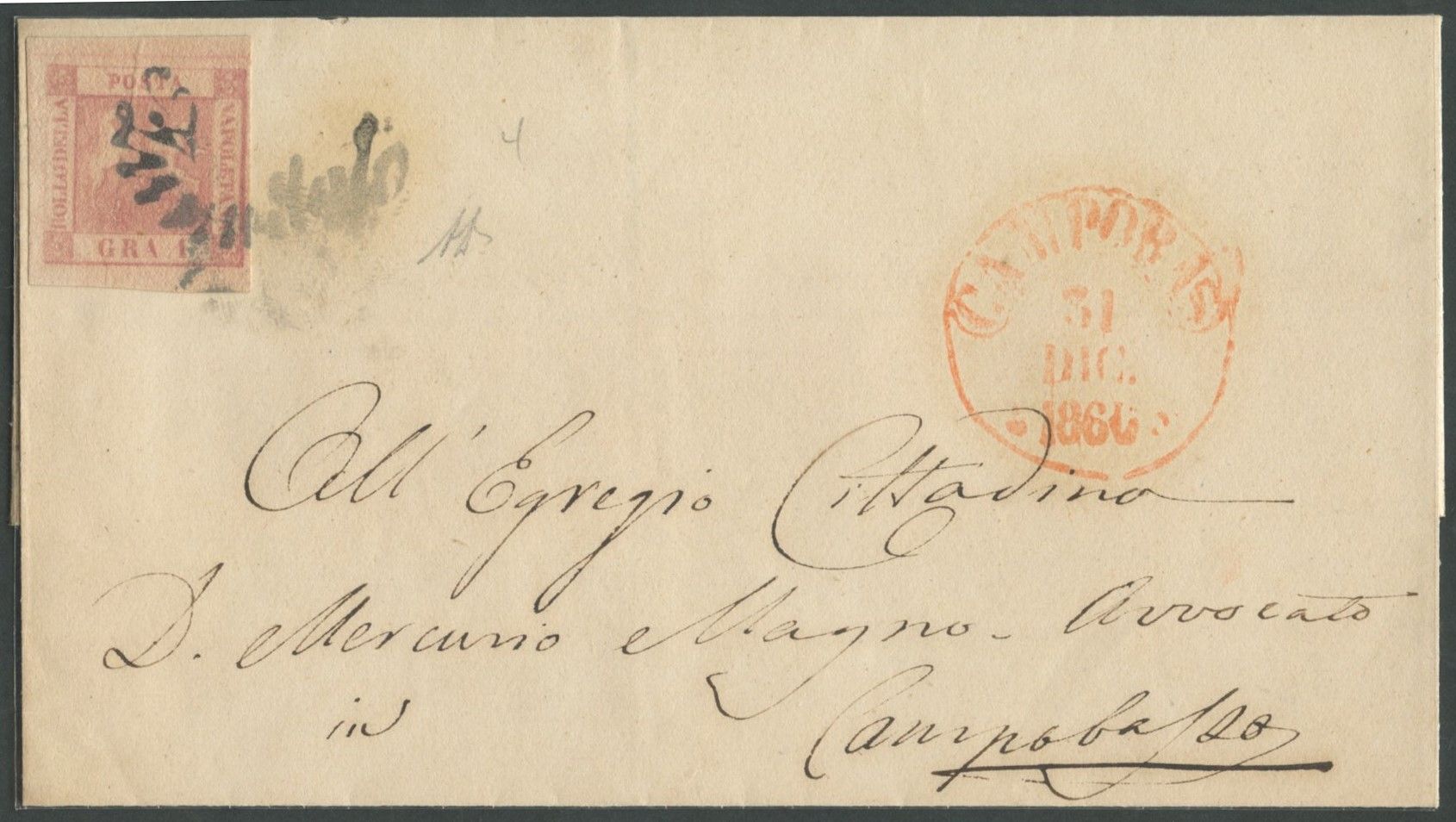 31.12.1860 - Lettera da Campobasso per città affrancata tramite 1gr. II tav. N.4. (Tariffe per lettere spedite nel circondario del mittente). Sull'affrancatura lo svolazzo di CAMPOBASSO (6pt). (A+) (A.Diena)