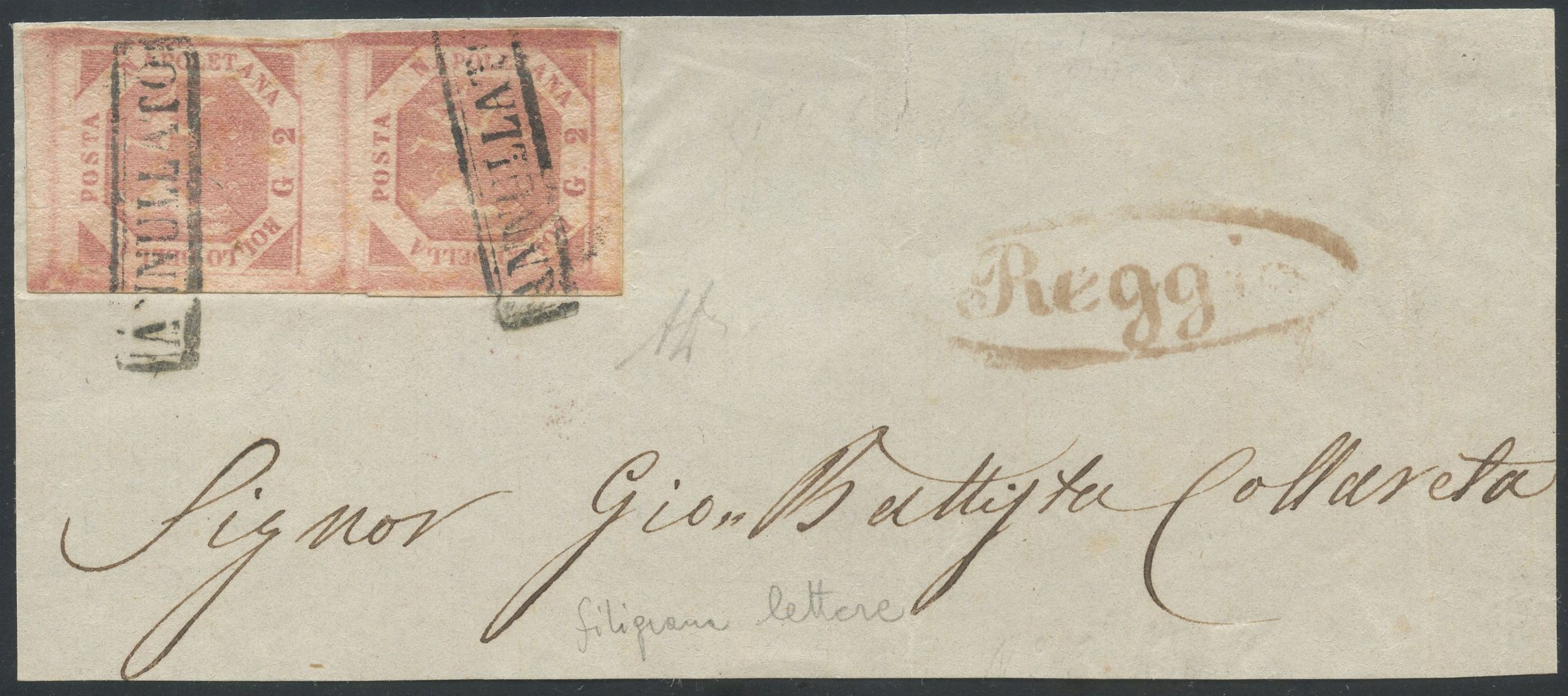 1858 - 2gr. II tavola rosa chiaro n.6 in coppia verticale con filigrana lettere (margine sinistro del foglio), conservata su grande frammento di lettera. Insieme non comune.