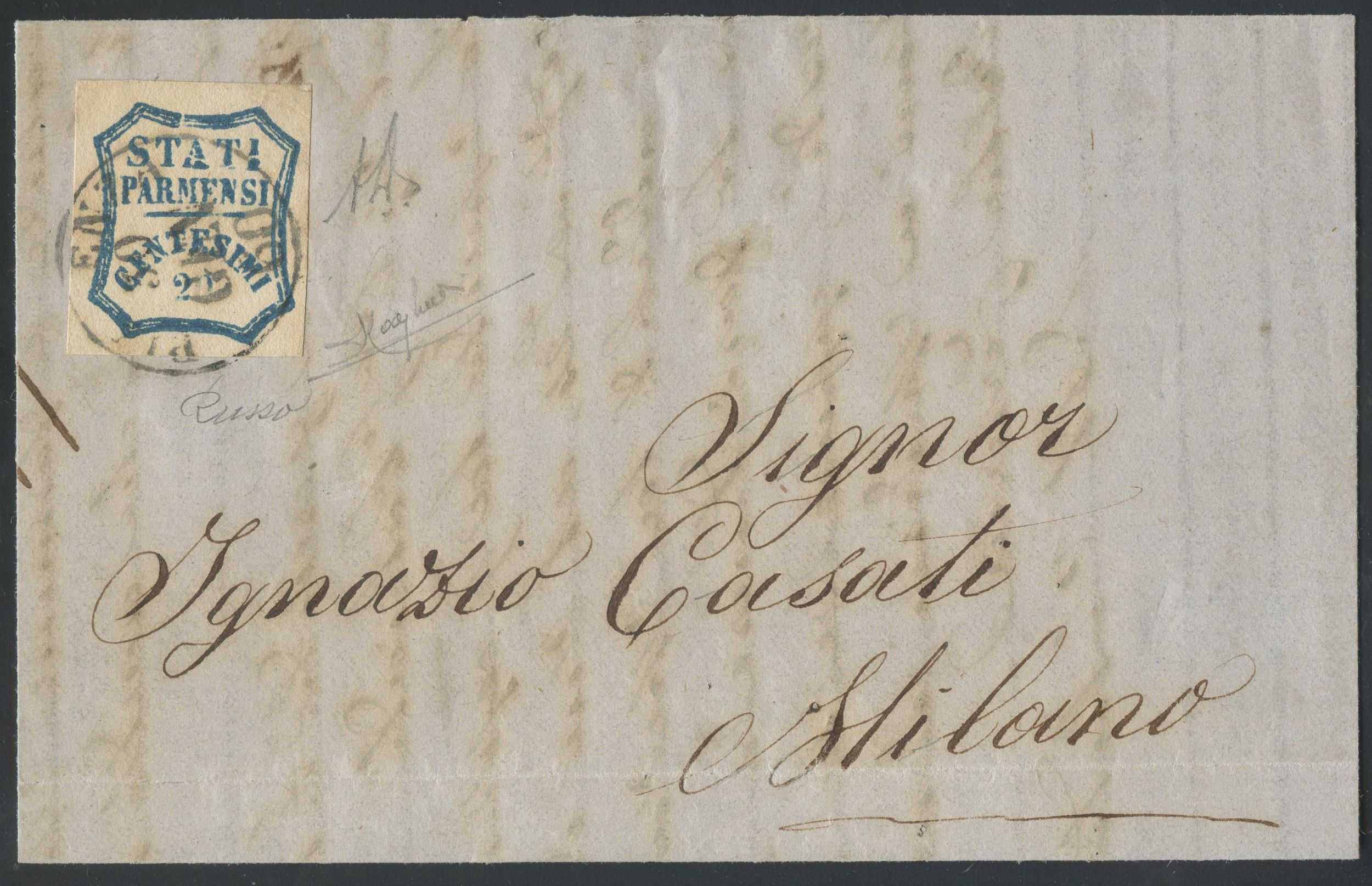 30.01.1859 - lettera da Piacenza per Milano affrancata tramite un 20 cent. azzurro con la scritta ''STATI'' attraversata da una linea bianca n. 15e. Oggetto di straordinaria qualità. (Alberto Diena, Raybaudi)