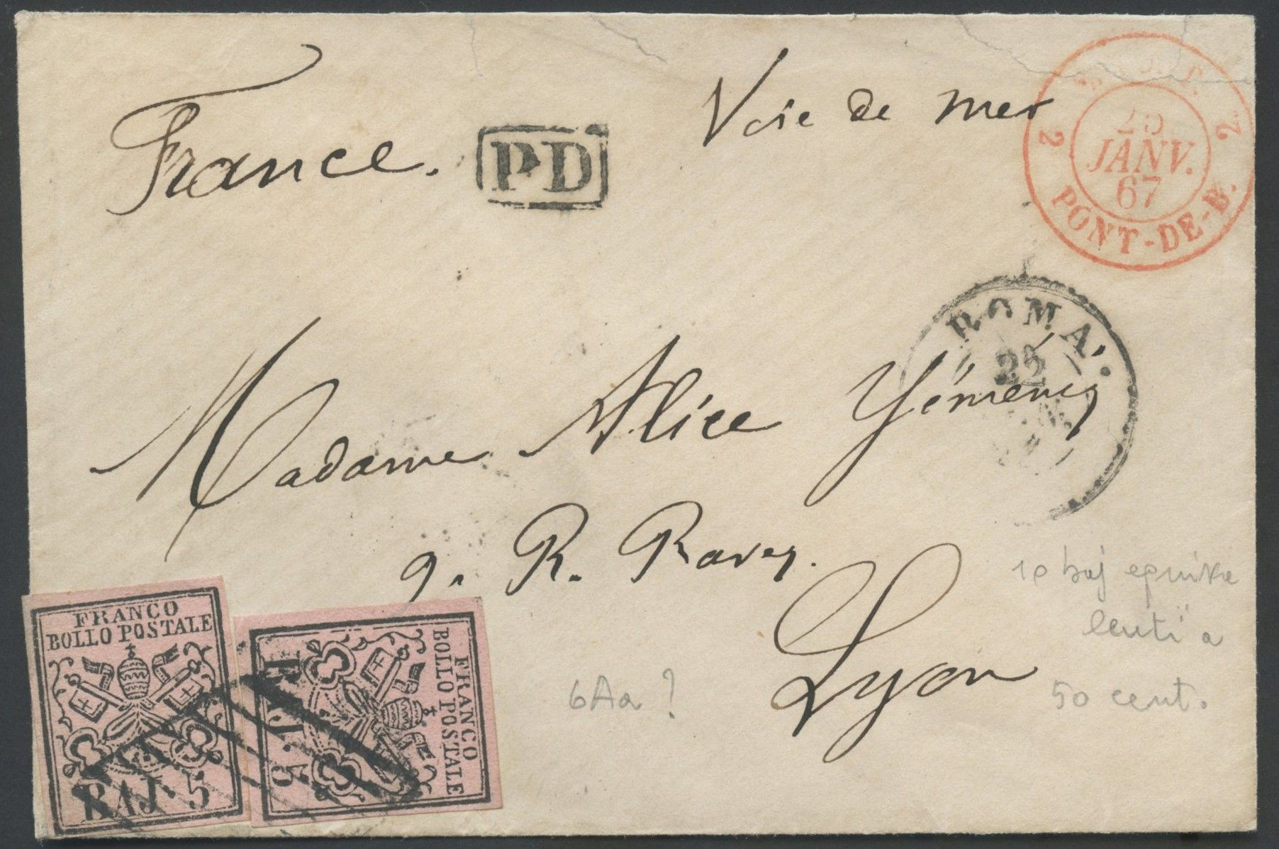 25.01.1867 - Busta da Roma per Lione affrancata per 10 baj. tramite due valori da 5b. rosa carminio n.6A. (A+)
