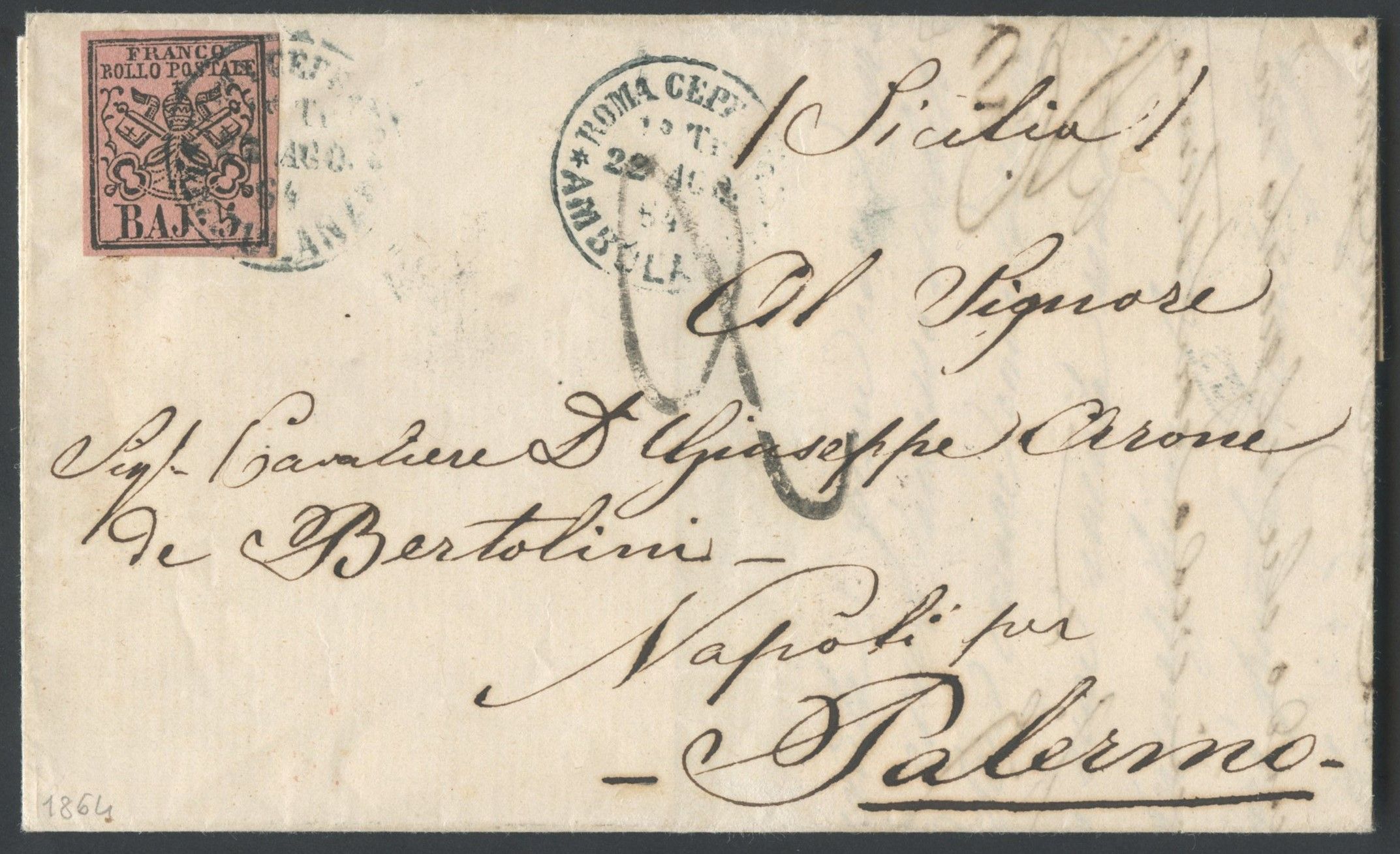 22.08.1864 - Lettera spedita da Roma per Palermo, dove giunse il 25 Agosto, transitata tramite la linea ambulante ROMA - CEPRANO. Sull'affrancatura il cerchio in Azzurro ''AMBULANZA 1° TRENO''. (LUX)