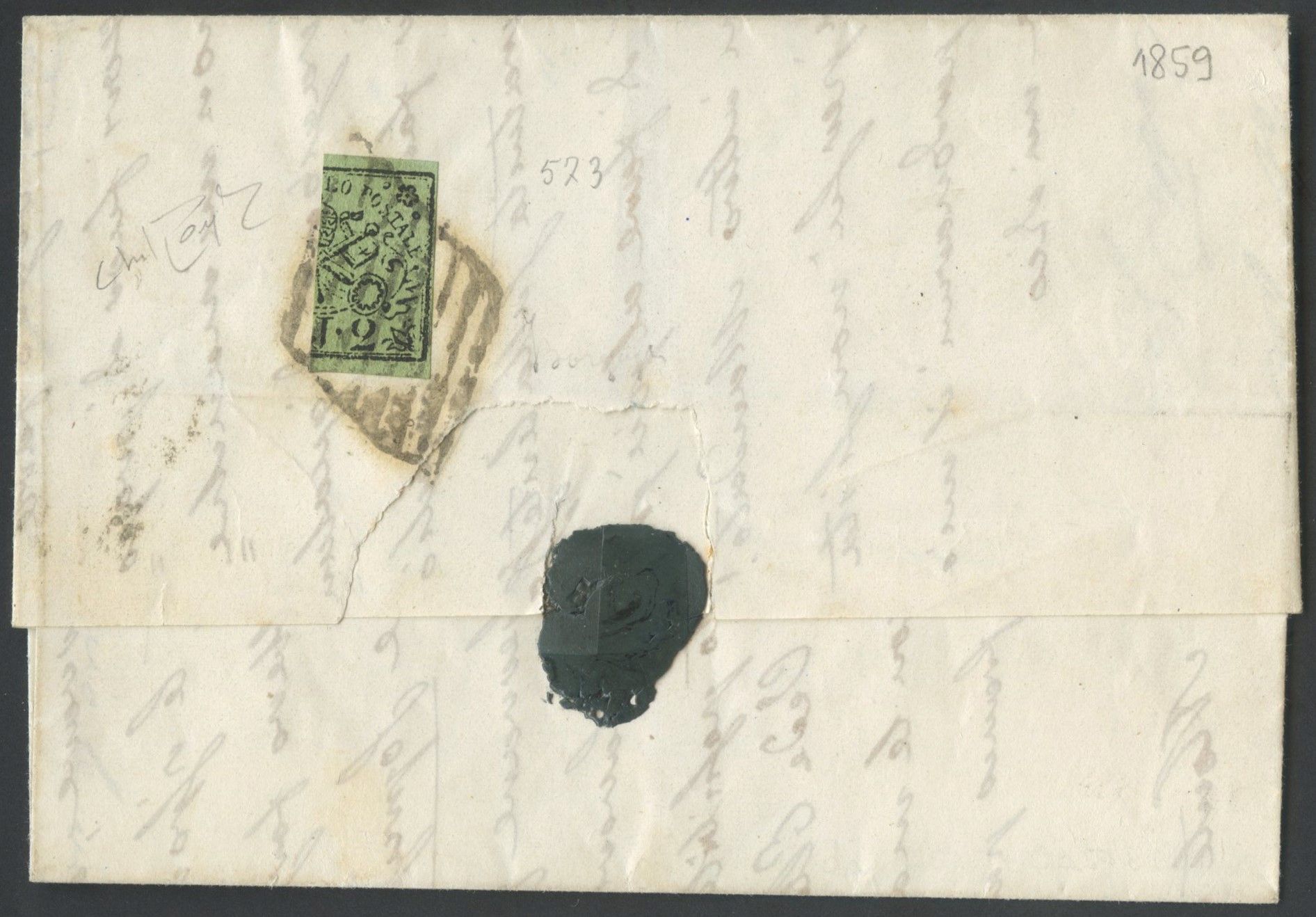 16.09.1859 - Lettera da Montecastelli per Perugia affrancata per 1 baj tramite un 2 b. verde giallastro n.3a frazionato a metà verticalmente. (A+) (Cert. Raybaudi)