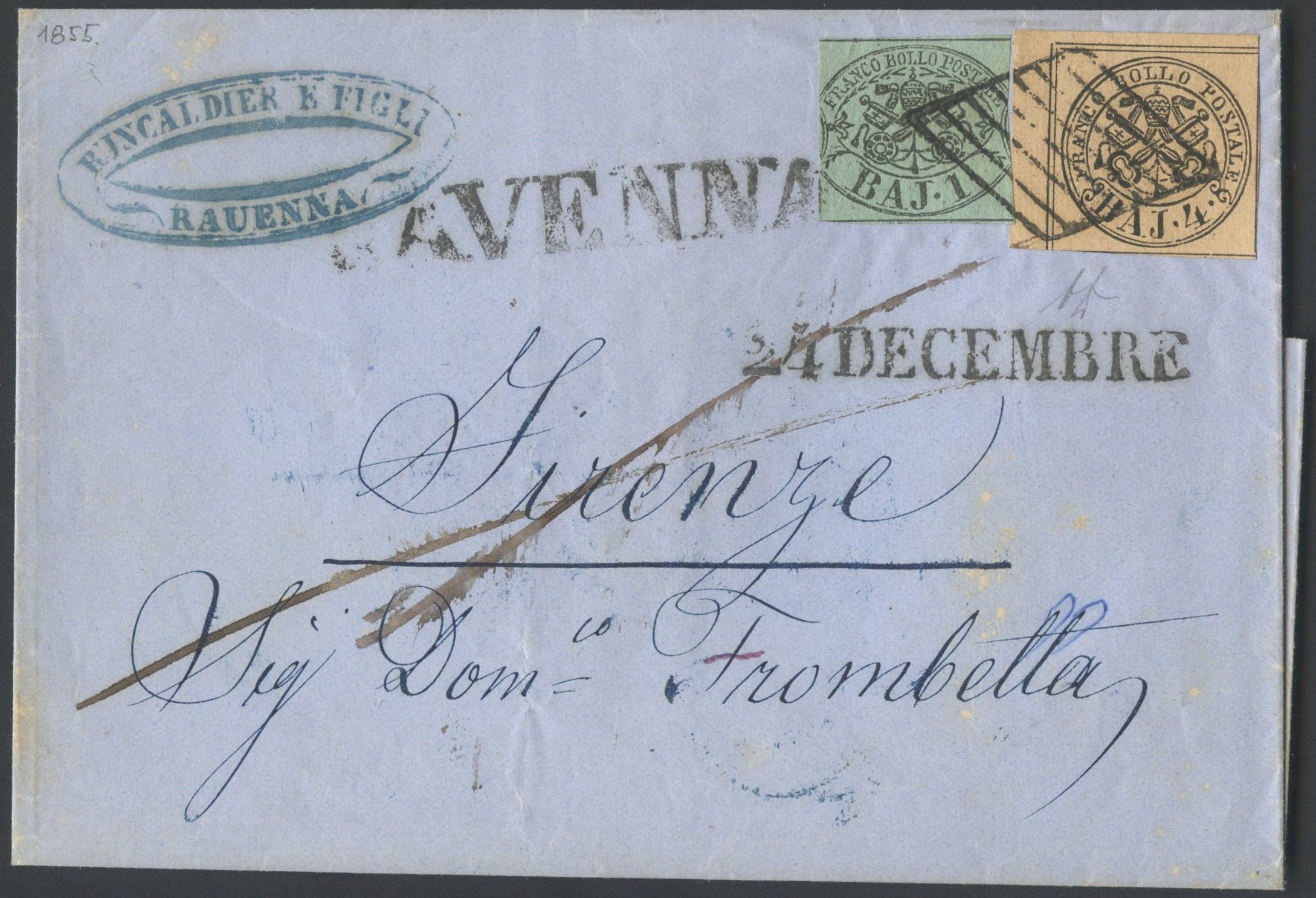 1855 - Busta da Ravenna per Firenze affrancata per 5 baj. tramite un 1b. grigio verdastro n.1 + 4b. Bruno grigio chiaro n.5 angolo di foglio a sinistra. (A-) (Alberto Diena)