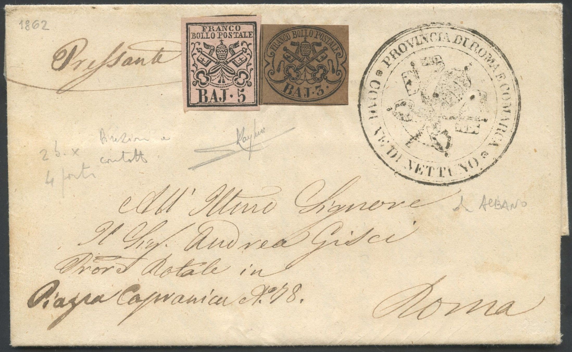 11.07.1862 - Lettera da Albano per Roma affrancata tramite un un 3b. + 5b. che non vennero annullati. (A+) (Raybaudi)