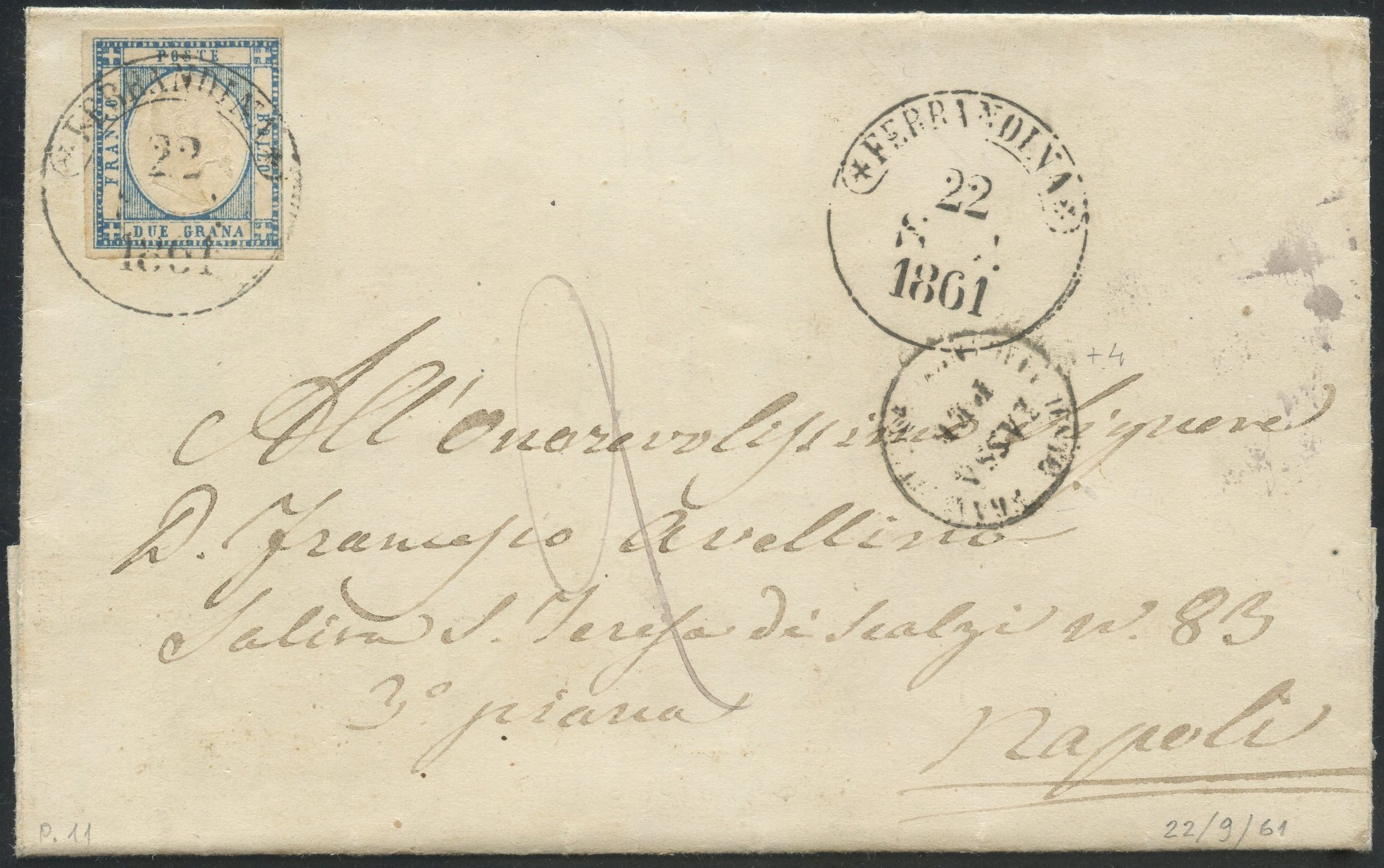 22.09.1861 - Lettera spedita da Ferrandina per Napoli affrancata tramite un 2gr. azzurro chiaro n.20. Sull'affrancatura il cerchio di FERRANDINA (11pt.) e sulla lettera il cerchio piccolo ''Tassa per insuff. affr.'' (+4pt.) (A-)
