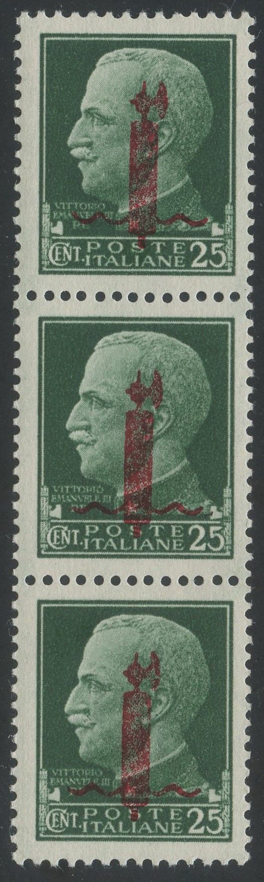 1944 - 25 cent. verde con soprastampa del tipo i in rosso n.490 in striscia verticale di tre nuovo con gomma integra.