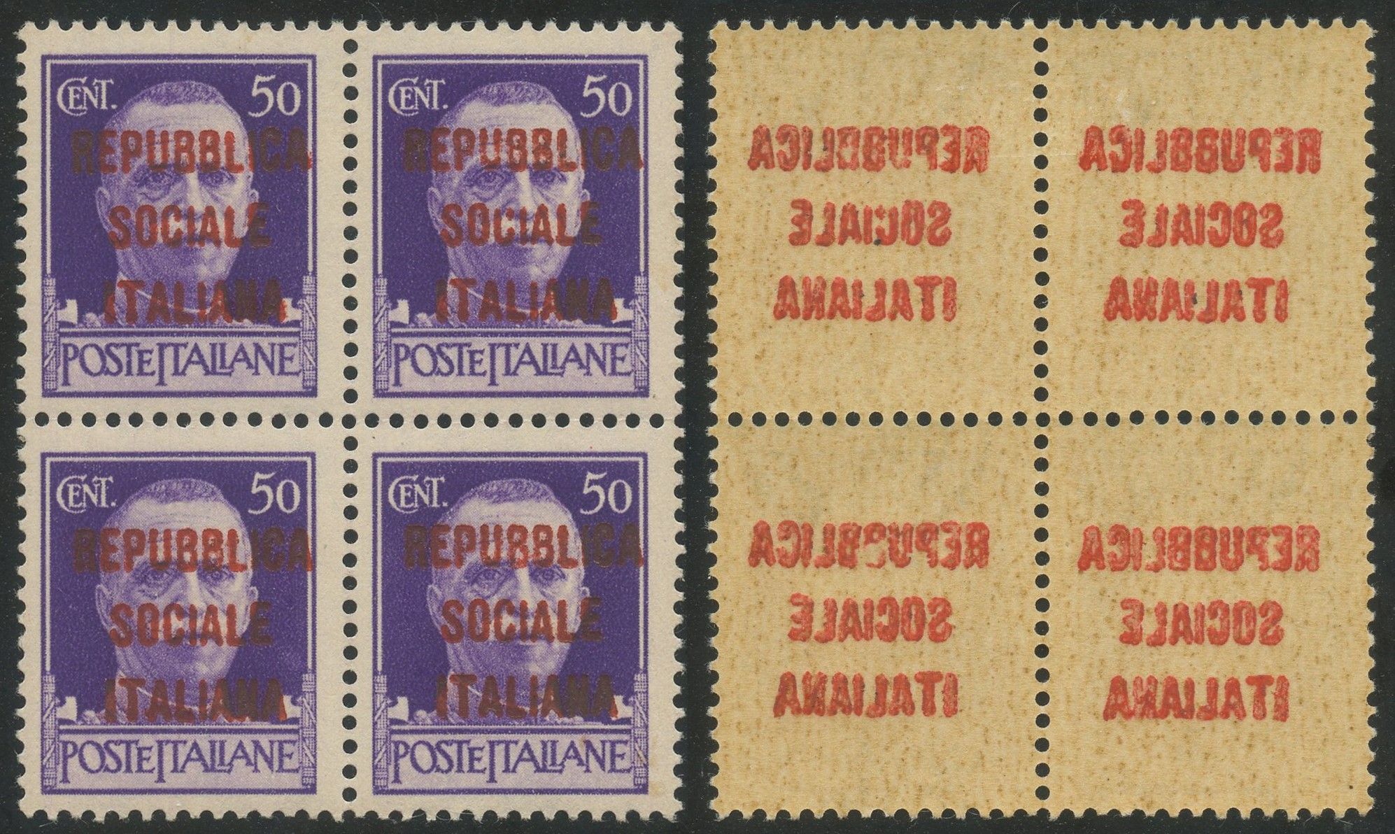 1944 - 50 cent. Tiratura di MILANO con soprastampa in ROSSO BRUNO, blocco di quattro nuovo con gomma integra. Al retro nitido decalco per tutti i valori.