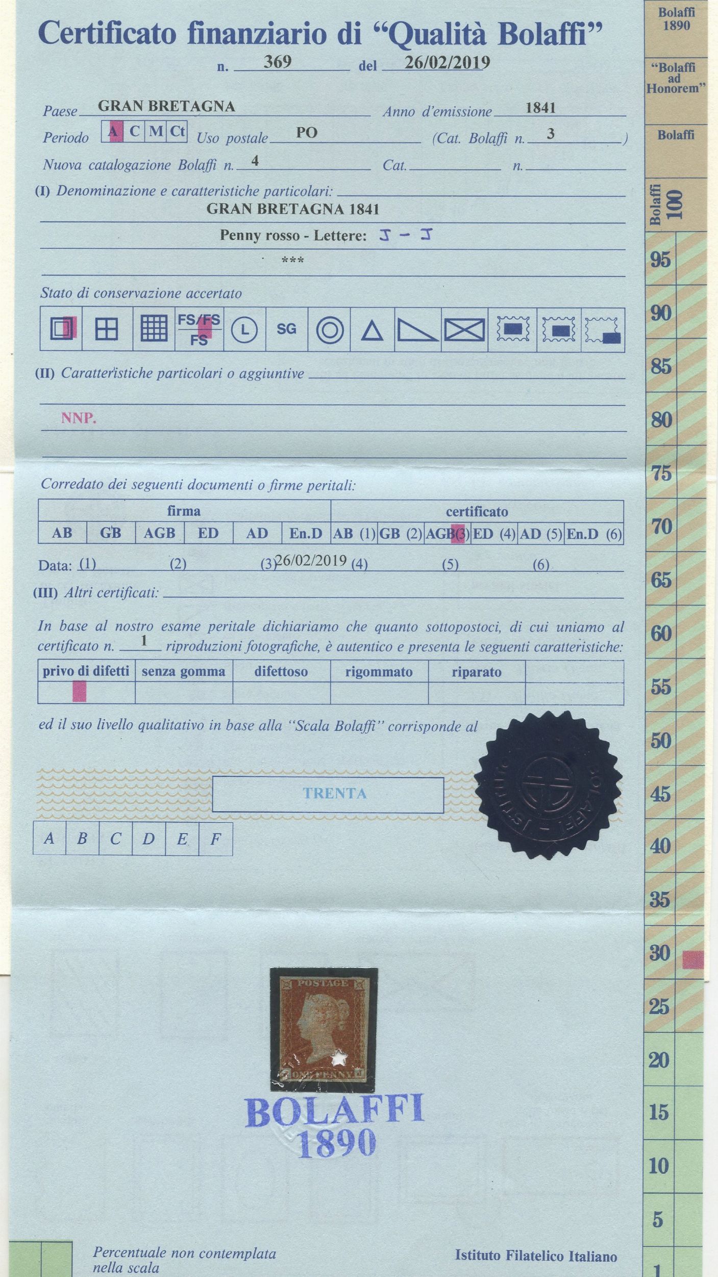 1841 - 1 penny bruno rosso su carta azzurrata n.3 nuovo con gomma integra MNH. Cert. Bolaffi