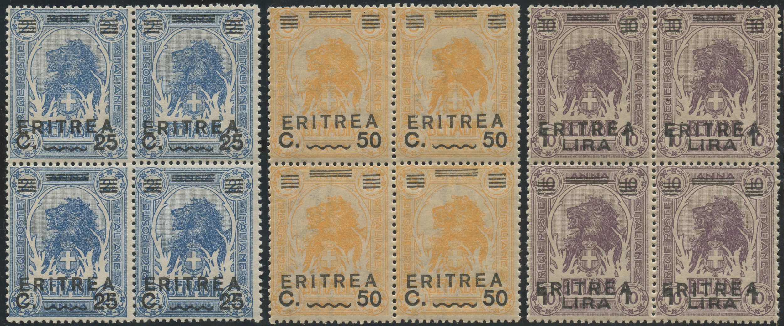 1922 - serie ''Leone o Elefante'' soprastampati n.54/60 in splendide quartine nuove con gomma integra. Splendido insieme.