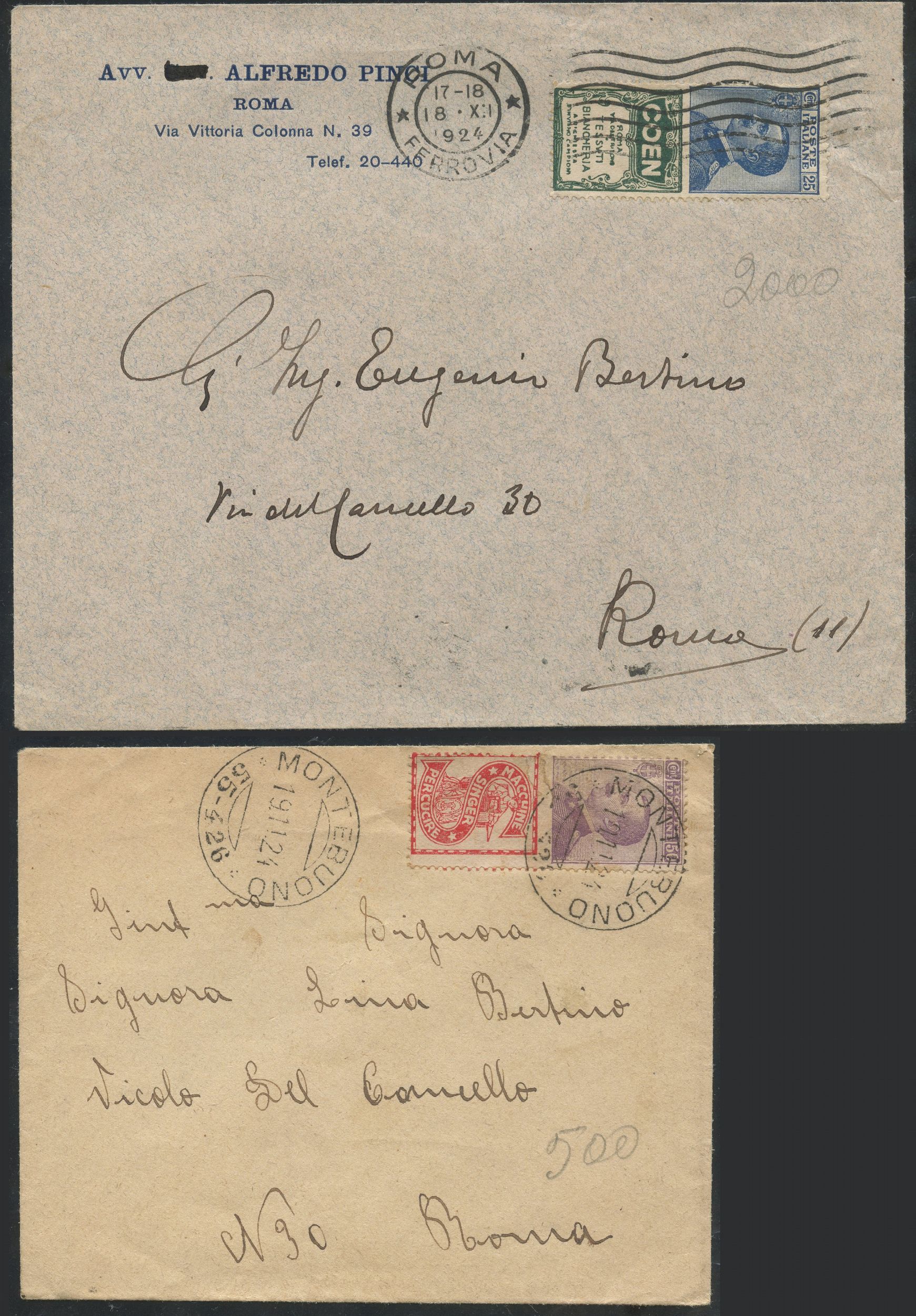 1924 - Due interessanti oggetti postali affrancati rispettivamente con i n.5 e n.16.
