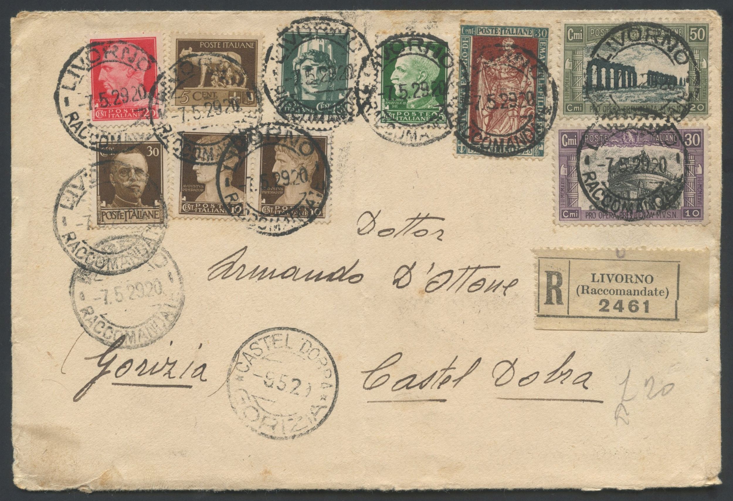 07.05.1929 - Busta raccomandata da Livorno per Gorizia con affrancatura coreografica composta da n.220, 221, 228,243, 245, 246, 247 e 249.