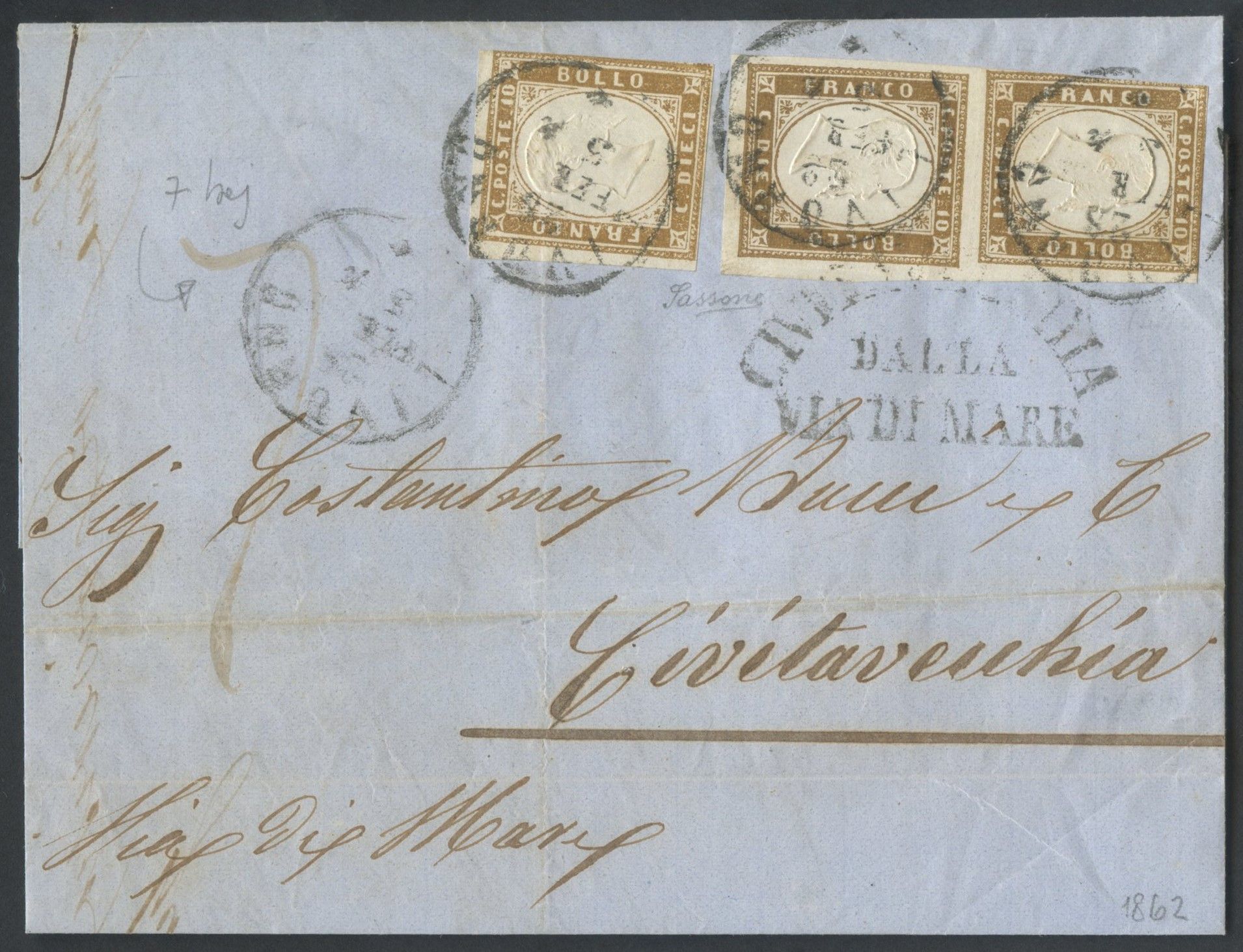 28.02.1862 - Busta da Livorno per Civitavecchia viaggiata ''Via di Mare'' ed affrancata per 30 centesimi tramite tre valori da 10 cent. bruno olivastro n.14Cl. (Tariffa non comune) (A-) (Sassone)