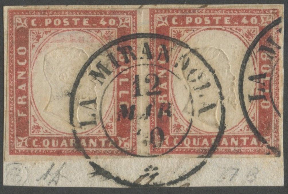 1860 - 40 cent. Rosa n.16Cc in coppia usata con l'annullo a doppio cerchio La Mirandola e conservata su piccolo frammento. Insieme raro. (A) (Alberto Diena, Cert. Cardillo)