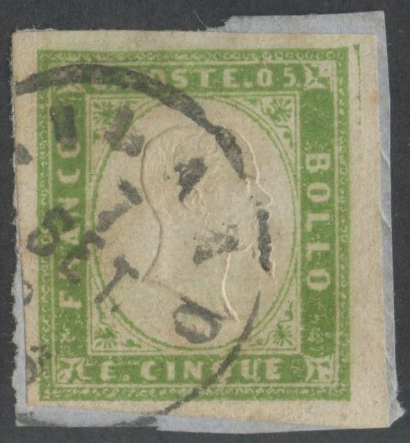 1859 - 5 cent. verde giallo brillante n.13B usato a Milano e conservato su piccolo frammento. (A+) (Ballabio)