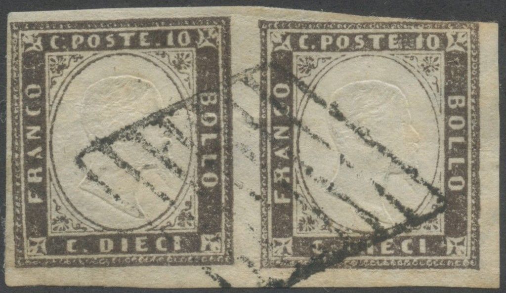 1859 - 10 cent. bruno grigiastro n.14A in versione scurissima in coppia usata tramite un annullo a griglia, l'esemplare di destra è a filo in alto l'altro splendido. (A) (Bottacchi)