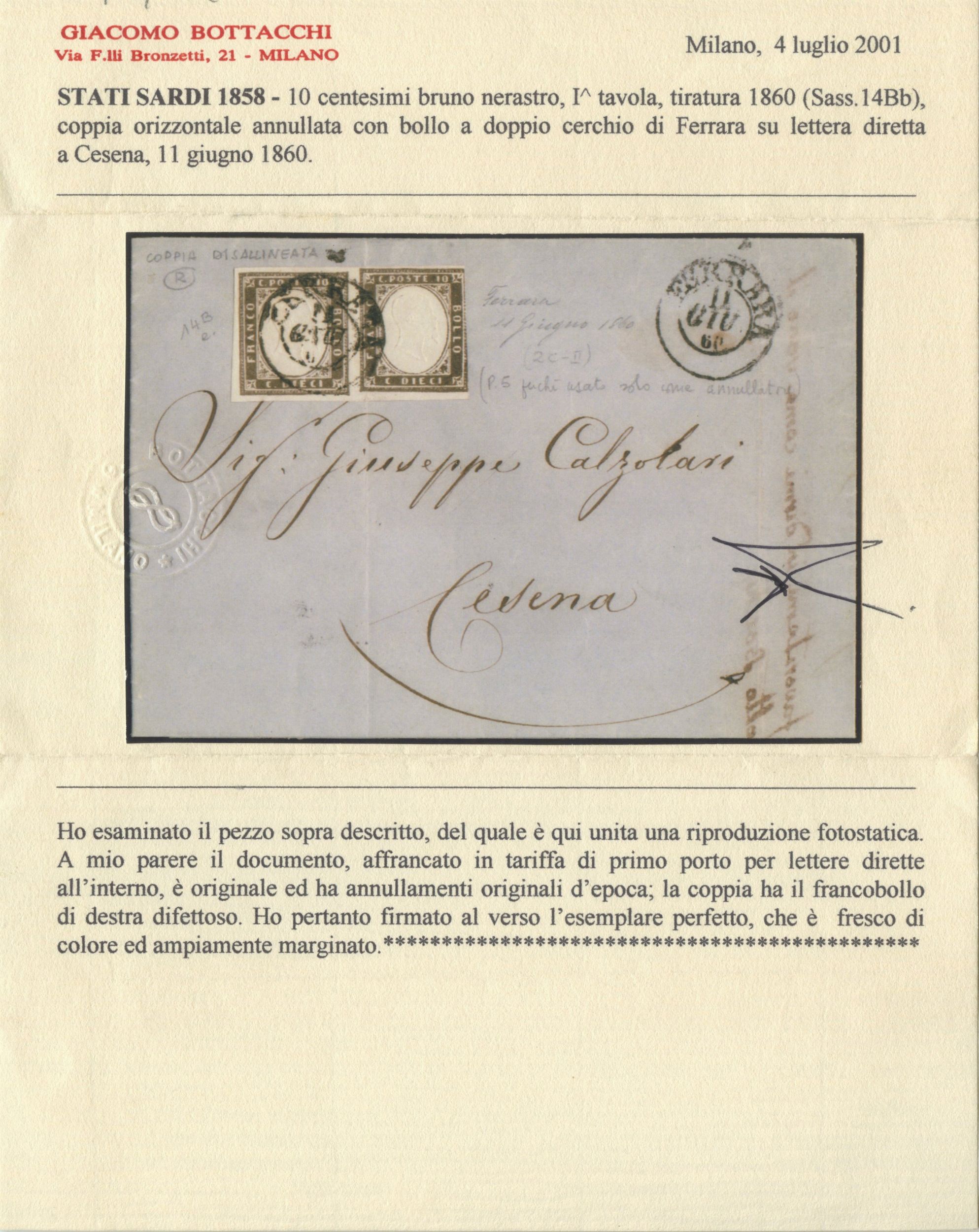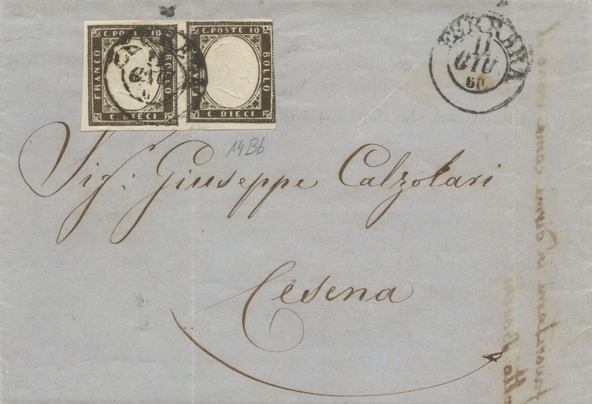 11.06.1860 - Lettera spedita da Ferrara per Cesena e affrancata per 20 centesimi tramite una coppia di valori da 10 cent. bruno nerastro n.14Bb. La coppia è composta da un esemplare di ottima qualità ed uno difettoso. Insieme molto raro. (A+/B) (Cert. Bot
