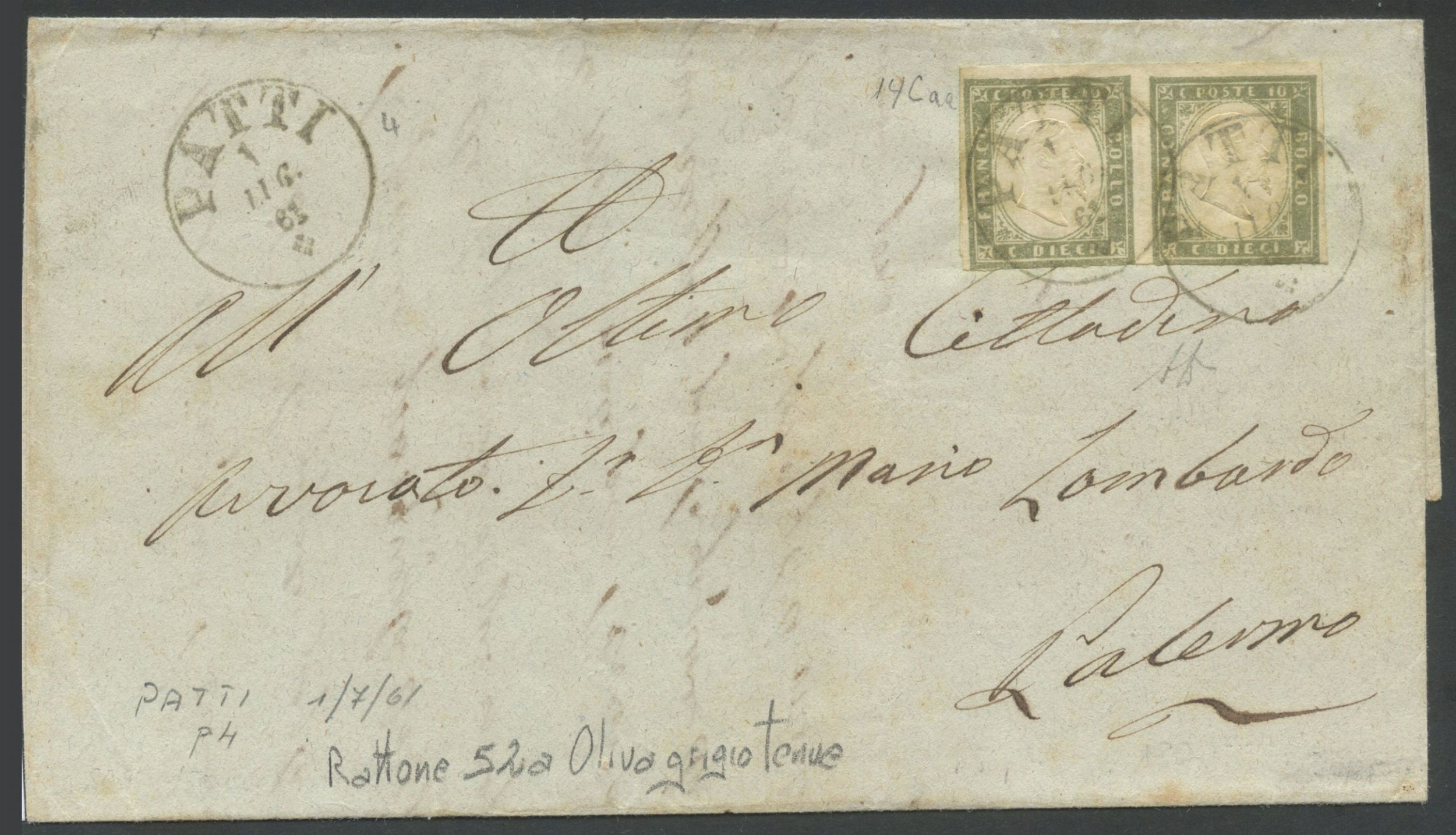 01.07.1861 - Lettera spedita da Patti per Palermo affrancata per 20 centesimi tramite una coppia del 10 cent. oliva grigio verdastro n.14Caa. (B) (Alberto Diena, cert. SP)