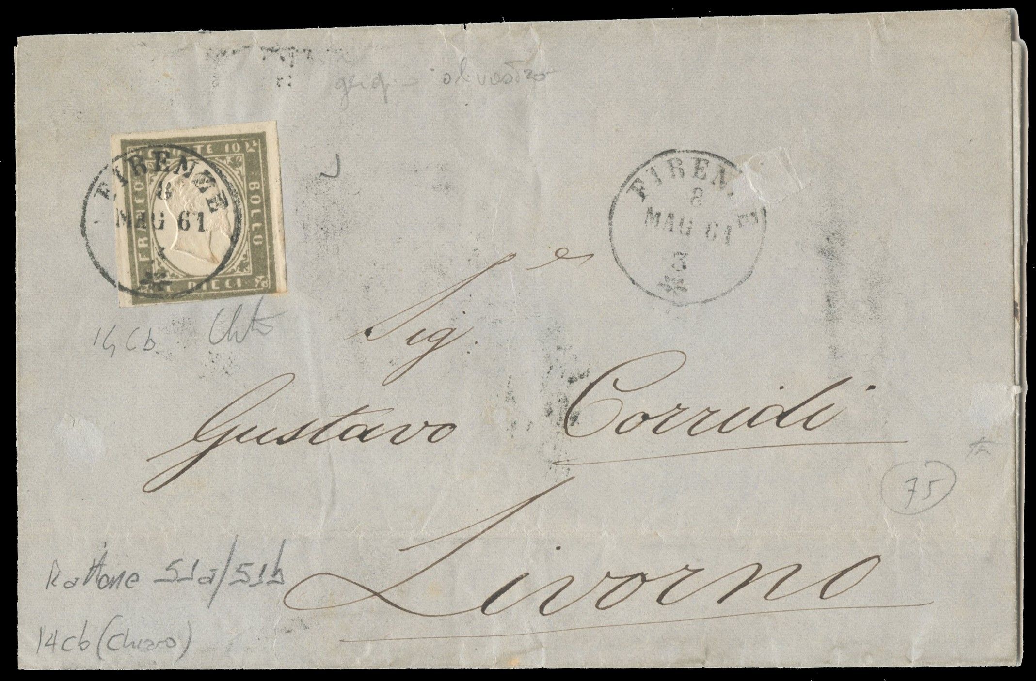 08.05.1861 - Lettera da Firenze per Livorno affrancata in tariffa di primo porto tramite un 10 cent. oliva grigio tenue (Rattone 51a) tonalità chiara del 14Cb. (B) (Ballabio)