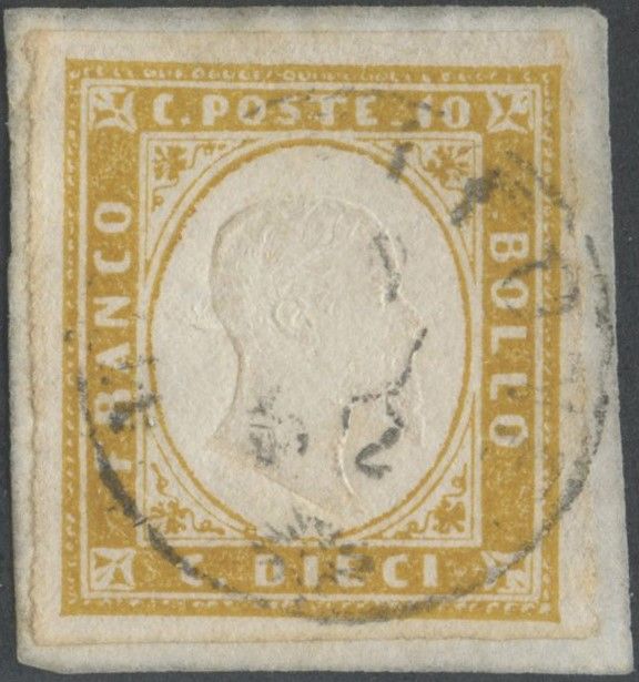 1862 - 10 cent. Giallo Olivastro (Nella nuance classificata dal Rattone come Ocra Olivastro) usato su piccolo frammento. (A) (Cert. Cardillo, Biondi)