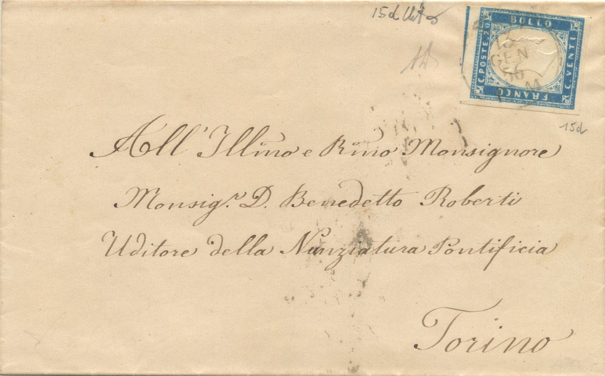 13.01.1856 lettera affrancata per 20 centesimi tramite un 20 cent. cobalto latteo vivace n.15d. (A-) (Alberto Diena, Ballabio)