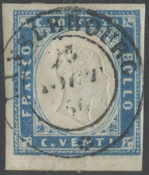 1856 - 20 cent. celeste con bordo di foglio in basso n.15f, usato con il doppio cerchio con rosetta di Lanslebourg. (Lux)
