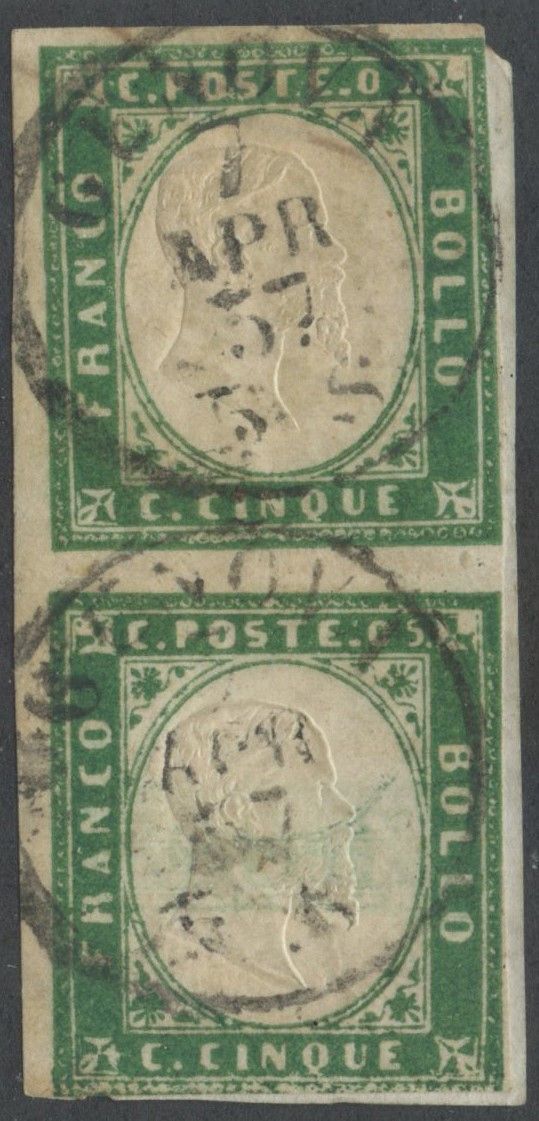1857 - 5 cent. Verde Scuro n.13Ac in coppia verticale. La rara coppia è impreziosita da una stampa parassitaria ed una doppia effige '' a cavallo '' riscontrabili sull'esemplare inferiore. (C) (Cert. Bottacchi, Ballabio)