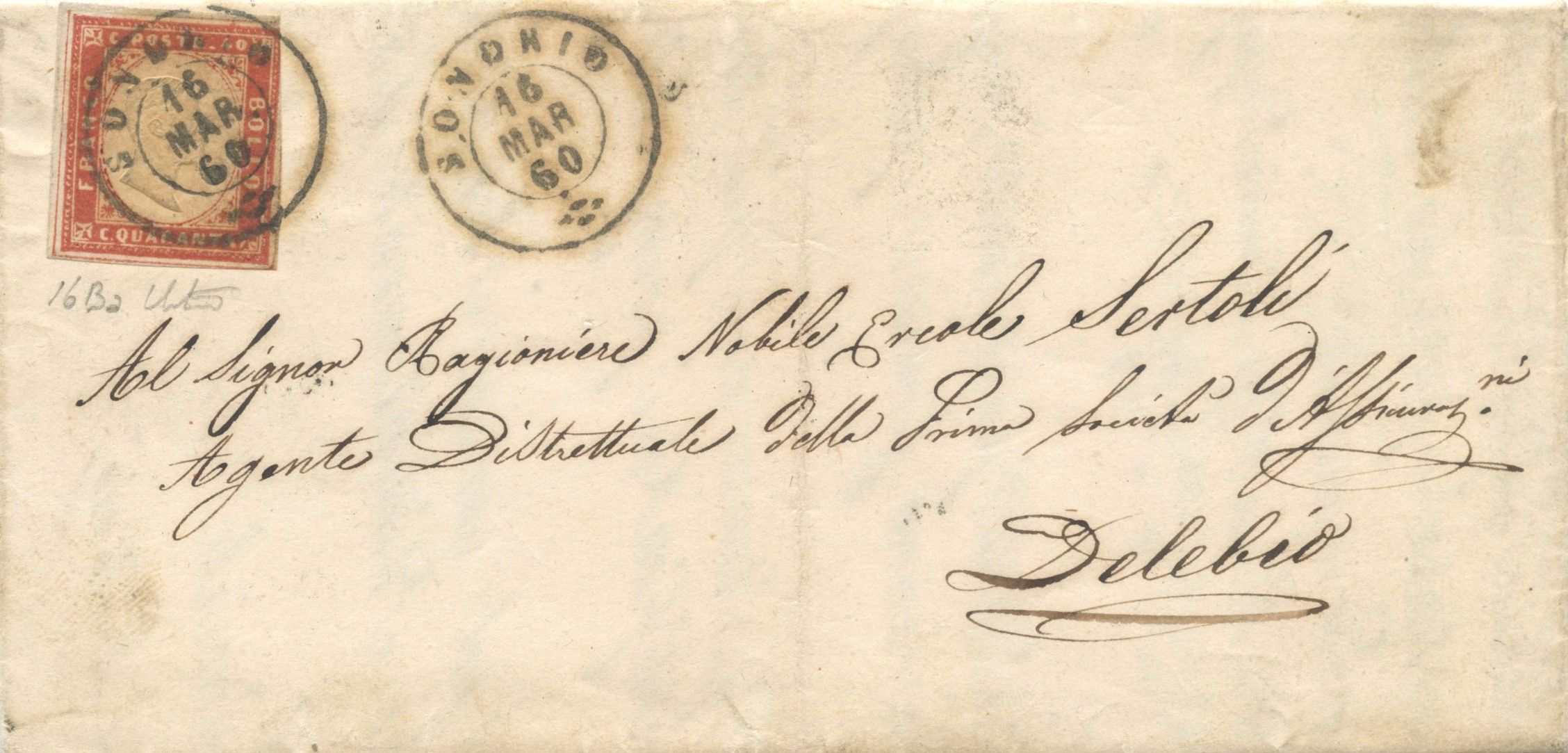 16.03.1860 - Lettera da Sondrio per Delebio affrancata tramite un 40 cent. vermiglio mattone n.16Ba Pos. 12. (B) (Ballabio)