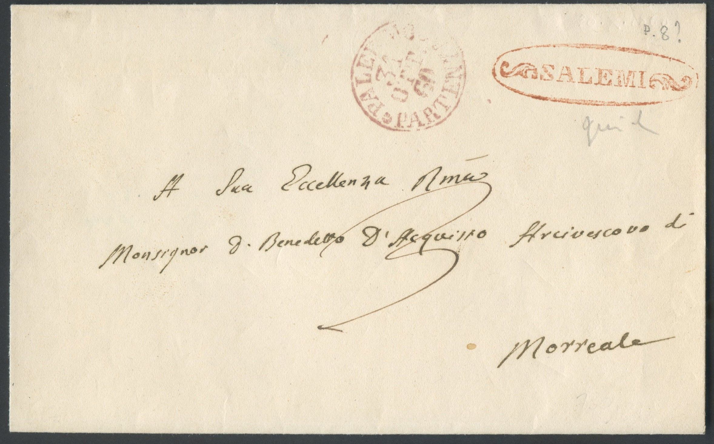 31.10.1860 - Busta non affrancata spedita da Salemi per Morreale. Sulla busta l'ovale di Salemi in rosso.