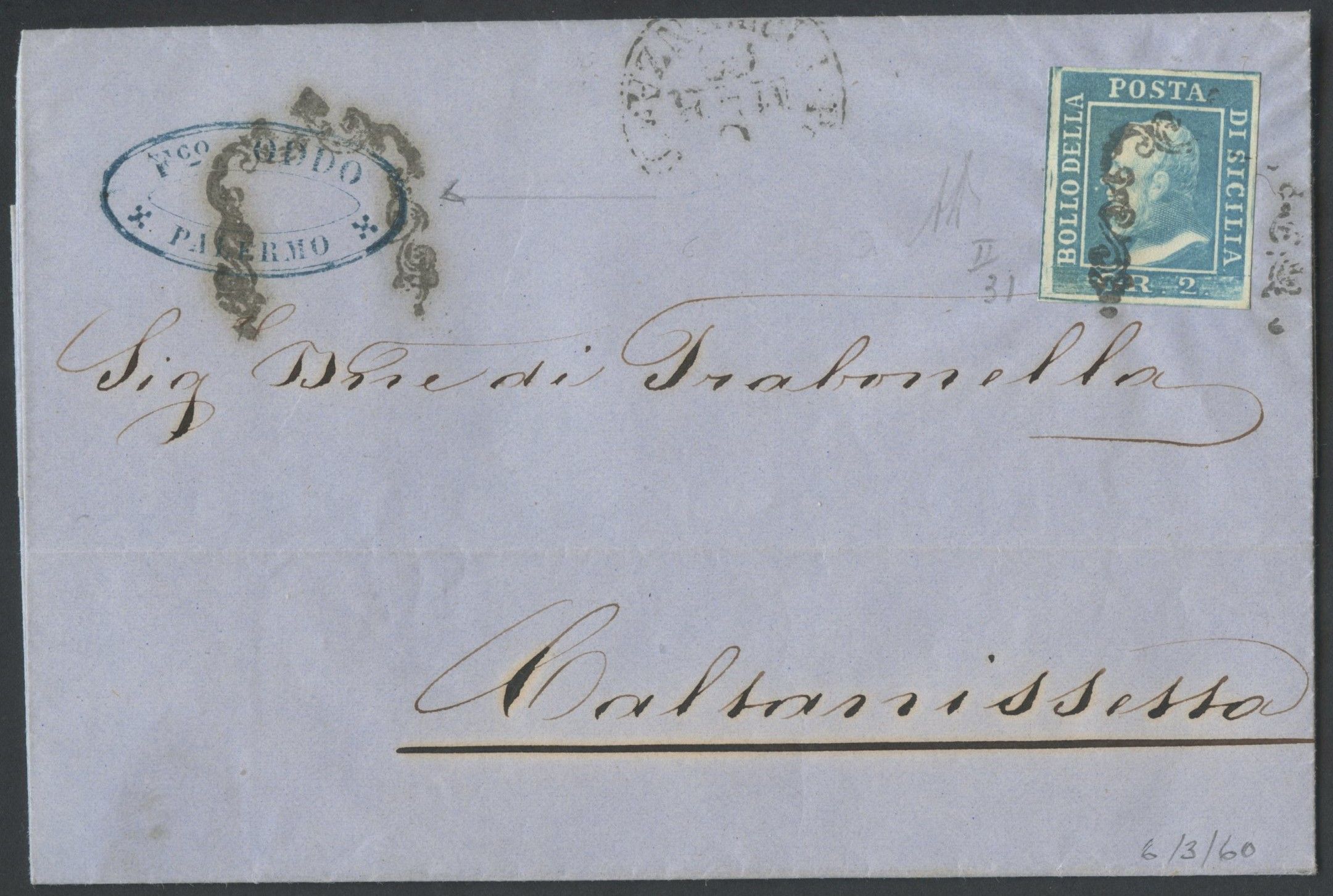 1858 - Busta da Palermo per Caltanissetta affrancata tramite un 2gr. cobalto n.7b. Sulla busta vi è ripetuto il ferro di cavallo, cosa che si verifica assai raramente essendo esso predisposto unicamente per l'annullamento dei francobolli. (LUX) (Alberto Diena)