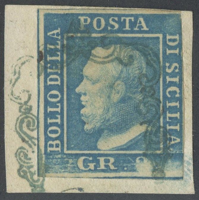 1859 - 2gr. I tav. azzurro annullato tramite un annullo a ''ferro di cavallo'' in azzurro e conservato su piccolo frammento. (A) (Emilio Diena)