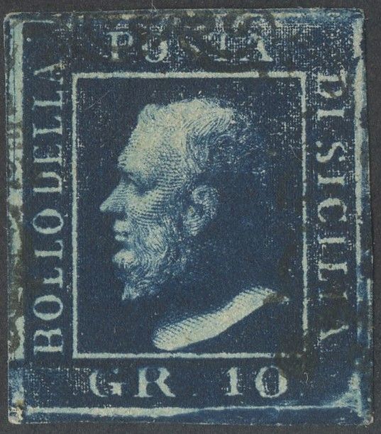 1859 - 10gr. azzurro cupo n.12 con ''stampa secca'', usato. (A+) (Emilio Diena, Alberto Diena)