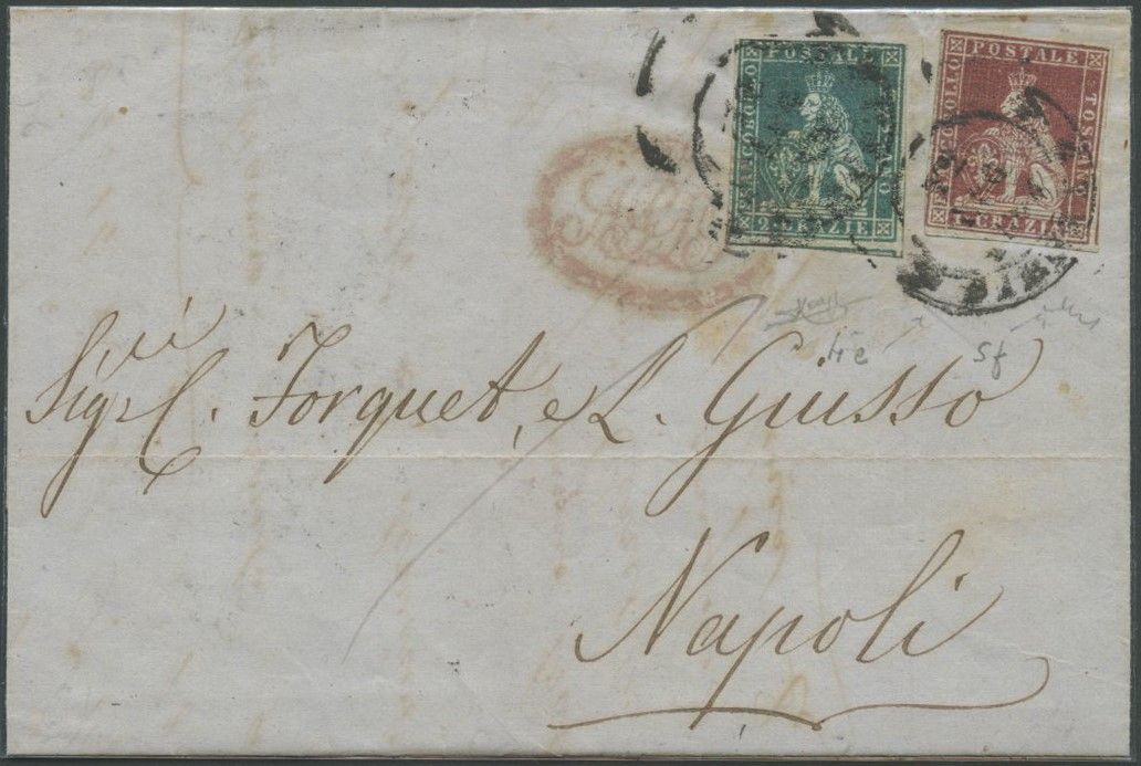 12.7.1856, lettera da Firenze per Napoli affrancata per 3cr. Tramite un 1cr.Cerminio Bruno su Grigio N.4e ed un 2cr. Verde azzurro su Grigio N.5f. Tariffa per lettere viaggiate via di terra per il regno delle due Sicilie. Tassata in arivo. (A-/A) (raybaudi, Chiavarello)