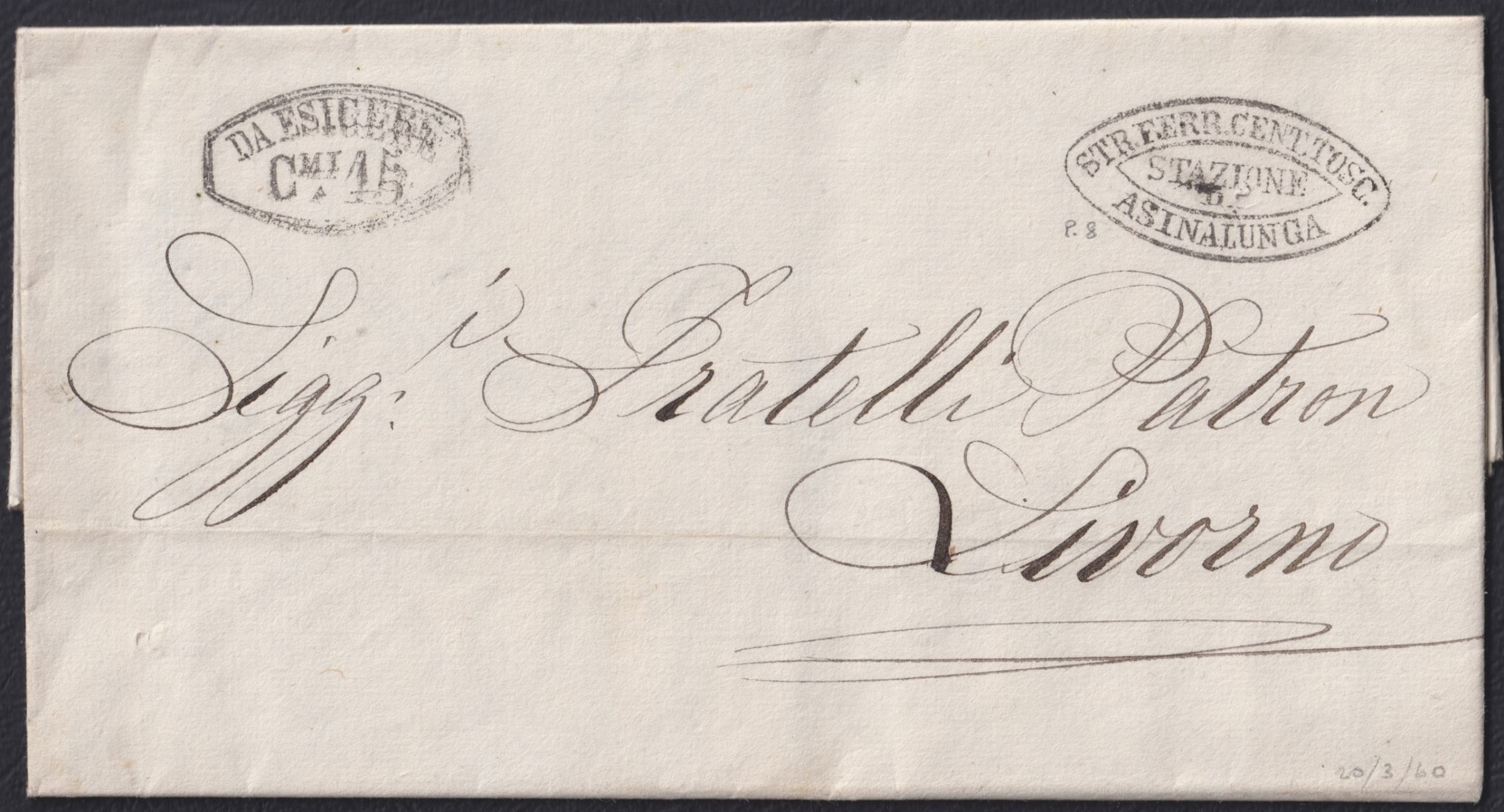 1860 - Lettera da Asinalunga per Livorno, sul fronte l'ovaloide ''STR. FERR. CENTR. TOSC. stazione di ASINALUNGA'' (8pt.) Ottima qualità.