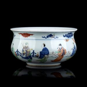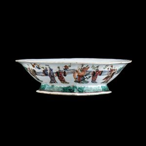 BACILE IN PORCELLANA CON DECORO A SMALTI POLICROMI Cina, XX secolo Sull'esterno si vedono gli Otto Immortali [..]