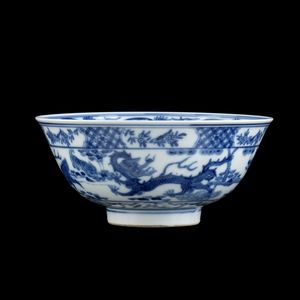 CIOTOLA IN PORCELLANA 'BIANCO E BLU' CON DECORO DI DRAGHI Cina, XX secolo Marchio apocrifo di Kangxi al centro [..]