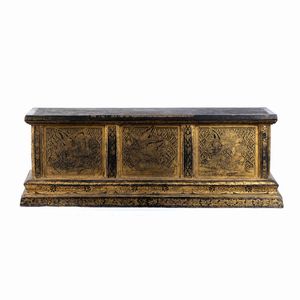 BAULE PER SCRITTURE IN LEGNO LACCATO E DORATO Thailandia, XIX secolo 32 x 91 x 33,5 cm Provenienza: collezione [..]