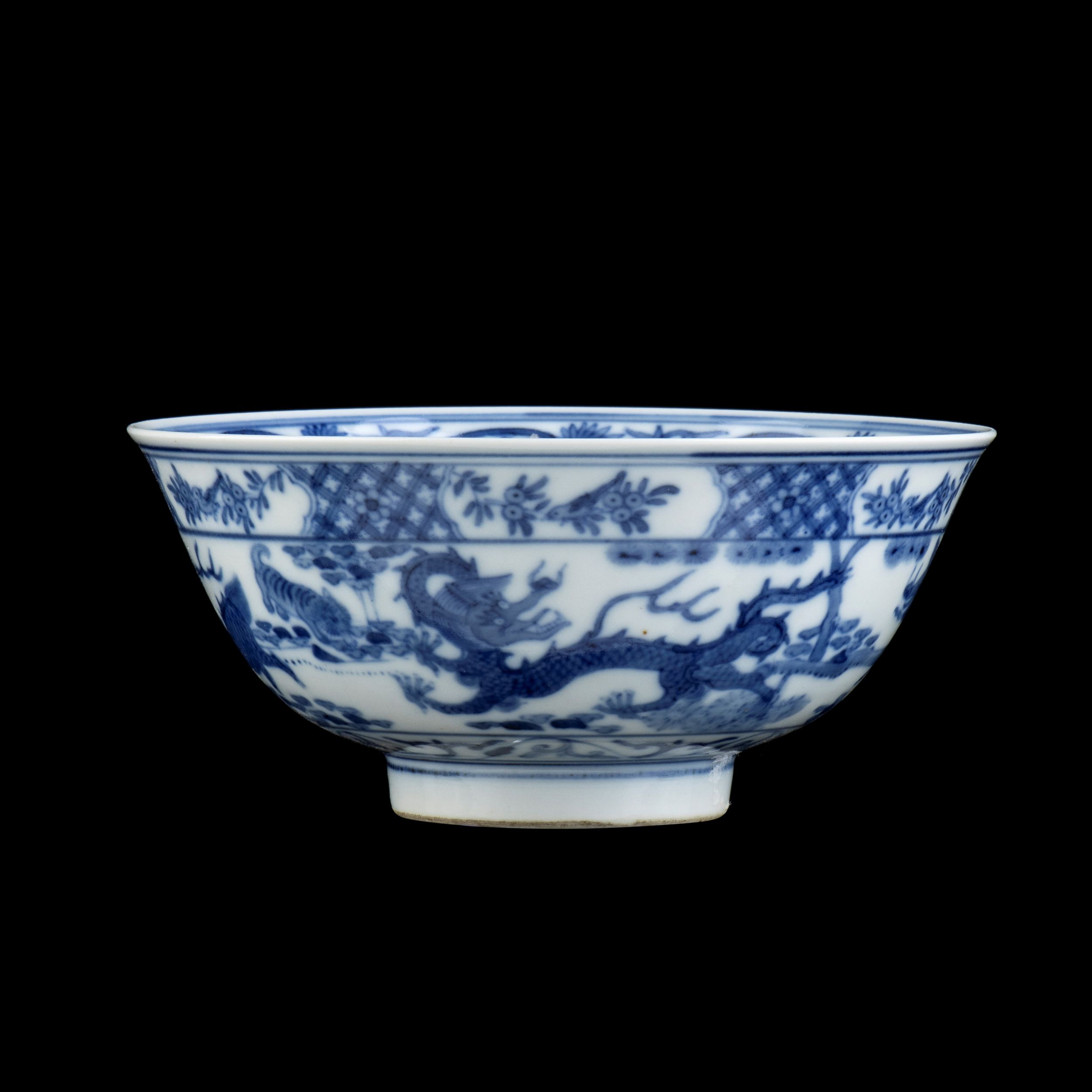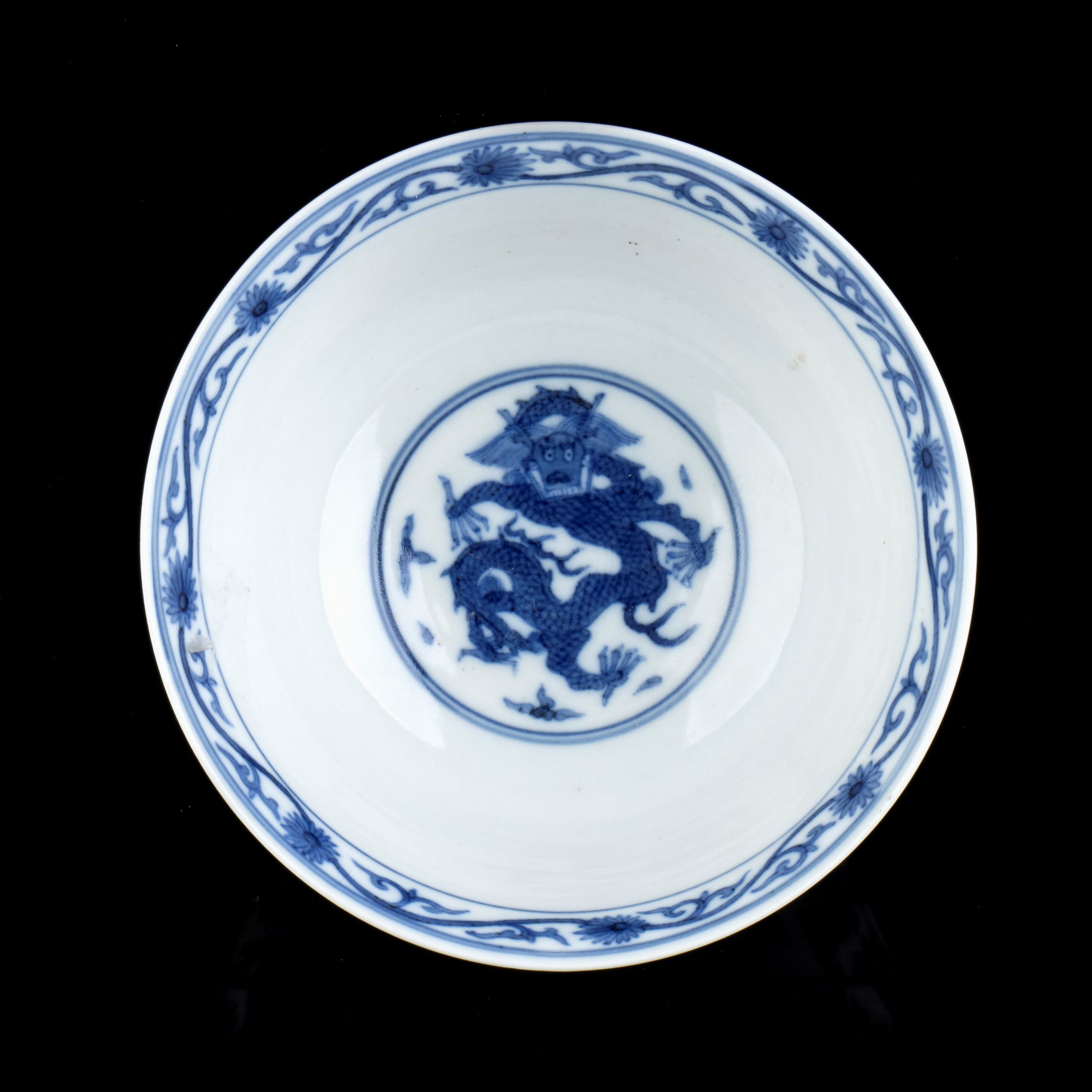 CIOTOLA IN PORCELLANA 'BIANCO E BLU' CON DECORO DI DRAGHICina, XX secoloMarchio apocrifo di Kangxi al centro della base.6,7 x 15 cmProvenienza: collezione privata italiana.