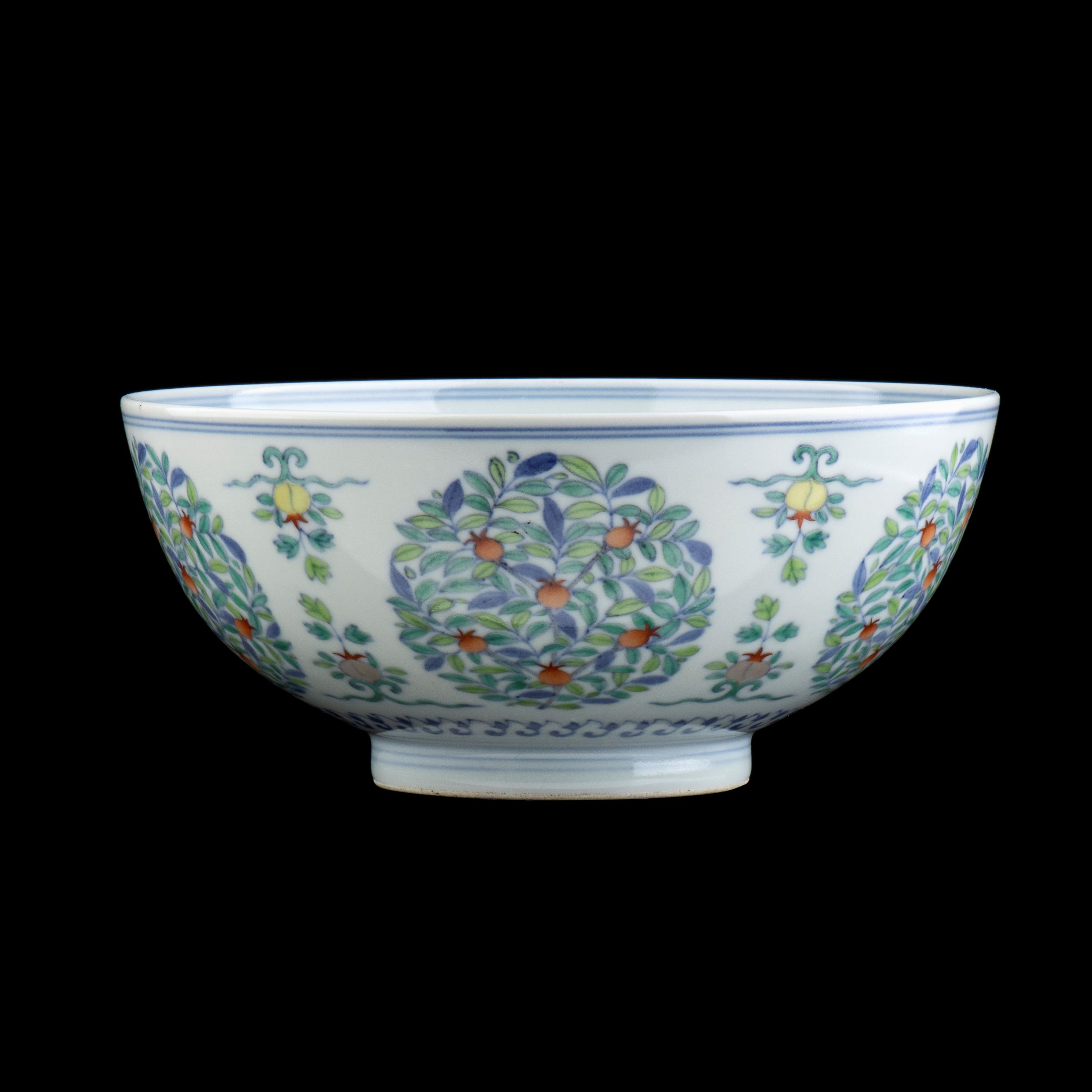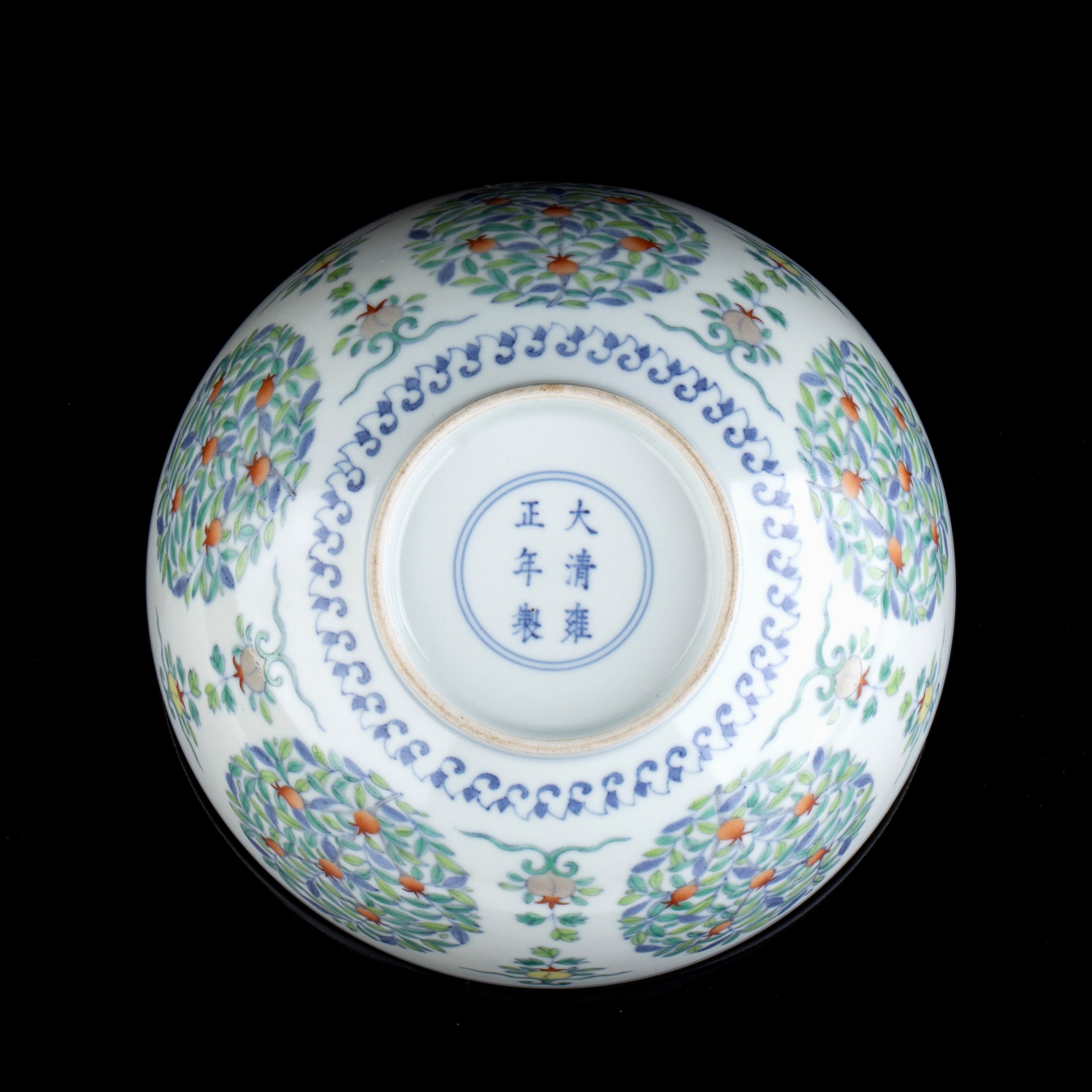 CIOTOLA IN PORCELLANA CON DECORO A SMALTI POLICROMI DOUCAICina, XX secoloMarchio apocrifo di Yongzheng al centro della base.8,5 x 18,5 cmProvenienza: collezione privata italiana.